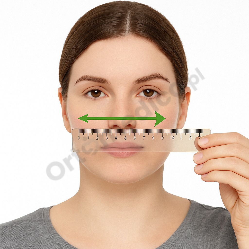 Umieść linijkę poziomo, tuż pod nosem, tak aby mierzyć szerokość nozdrzy (najszerszy punkt).