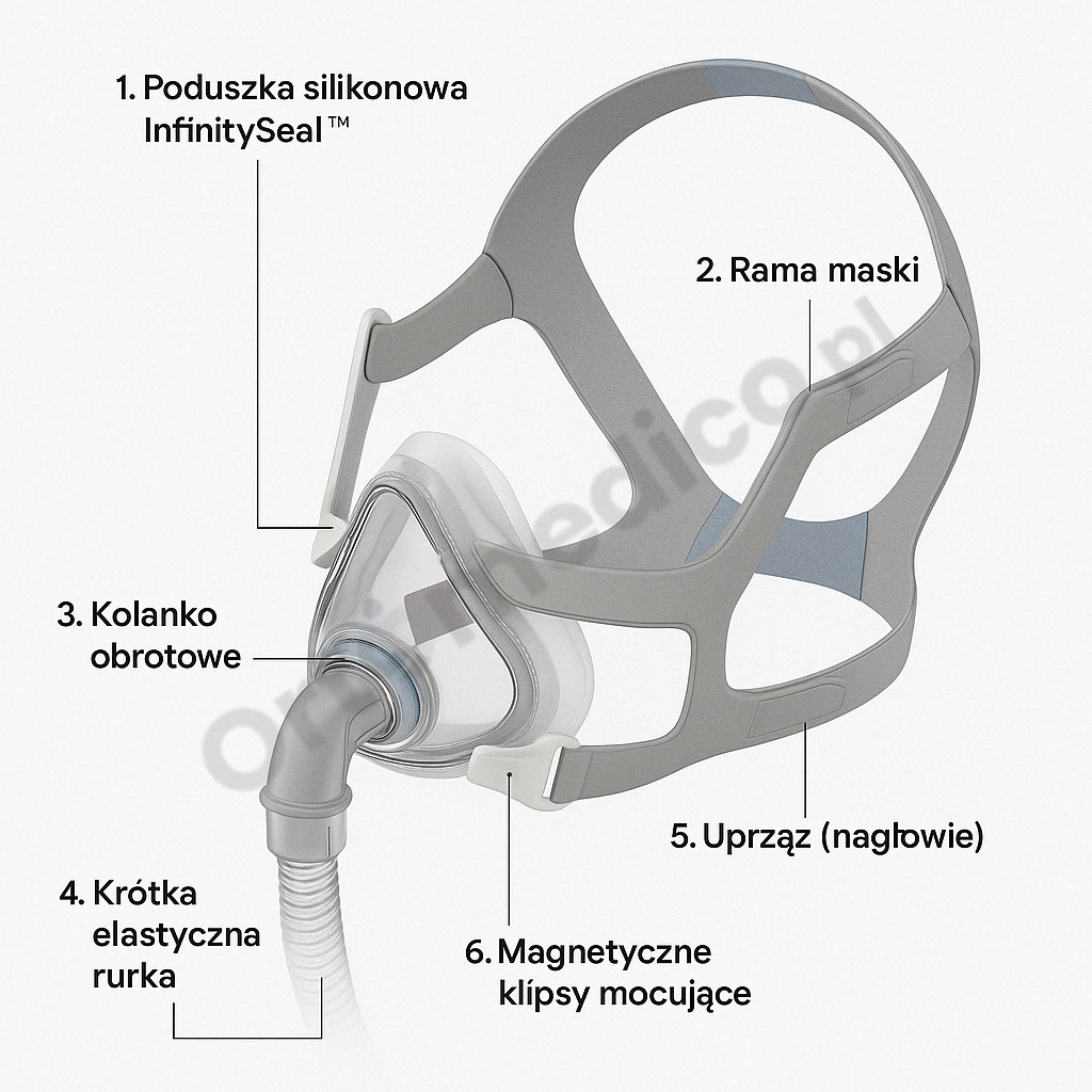 - Zgodność z normami międzynarodowymi – magnesy zastosowane w masce spełniają zalecenia ICNIRP (dotyczące bezpieczeństwa pola magnetycznego), a cały produkt został opracowany zgodnie z normami jakości ResMed.