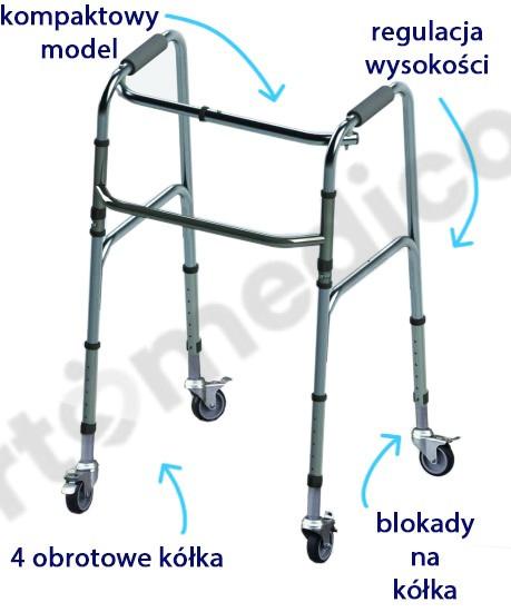 4 obrotowe koła: umożliwiają płynne poruszanie się po różnych powierzchniach, co sprawia, że balkonik jest łatwy w obsłudze.