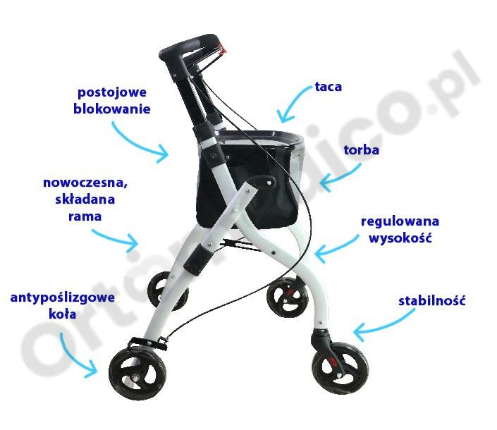 Standardowe wyposażenie: Obejmuje hamulec z systemem postojowego blokowania, torbę na zakupy nylonową oraz tacę, co zwiększa funkcjonalność i użyteczność podpórki.