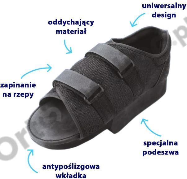 System zapinania taśm velcro umożliwia łatwe zakładanie i zapięcie buta nawet na stopę o dużej deformacji lub zabezpieczoną bandażem. Konstrukcja podeszwy buta została zaprojektowana tak, aby odciążać przodostopie, co może przyczynić się do zwiększenia komfortu użytkowania, zwłaszcza w przypadku problemów z tą częścią stopy.