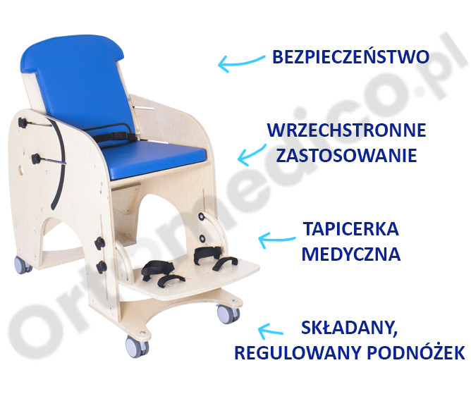 Bezpieczne wsparcie w siedzeniu - fotelik dedykowany dzieciom, które mają trudności z samodzielnym utrzymaniem pozycji siedzącej, w szczególności z powodu schorzeń neurologicznych lub ortopedycznych.