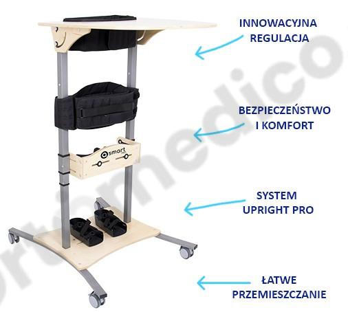 Konstrukcja pionizatora gwarantuje stabilność oraz poczucie bezpieczeństwa, a jednocześnie umożliwia swobodę ruchu w obrębie kończyn górnych. To idealne wsparcie w procesie rehabilitacji i codziennej aktywności. - Zaawansowany system UPRIGHT PRO