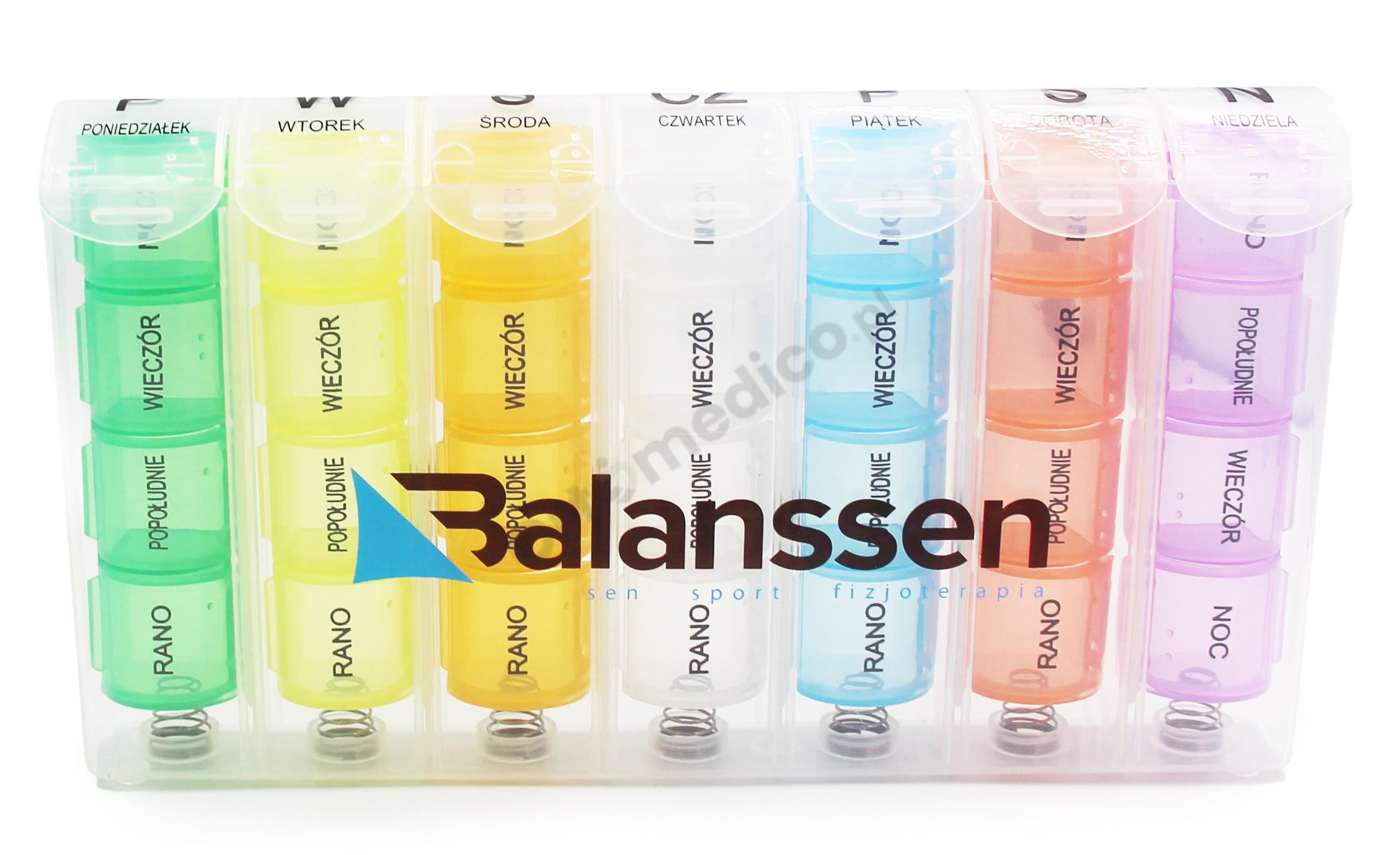 Wygodny i praktyczny organizer, który pomaga w przyjmowaniu leków zgodnie z zaleceniami lekarza. Pojemnik składa się z 28 przegródek, podzielonych na 7 dni tygodnia i 4 pory dnia. Każda przegroda jest opisana, aby ułatwić identyfikację leków. Pojemnik jest wykonany z wytrzymałego plastiku. Jest dobrą inicjatywą podczas wyjazdów, czy również dla seniorów, których dzienna ilość przyjmowania medykamentów jest wysoka.