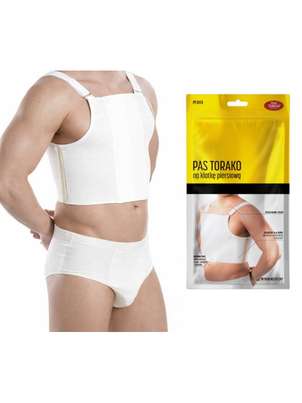 Pas torako dla mężczyzn Pani Teresa PT0113 to wyrób medyczny wielokrotnego użytku, przeznaczony do stabilizacji klatki piersiowej u mężczyzn po zabiegach operacyjnych, urazach oraz w trakcie leczenia i rehabilitacji. Produkt zapewnia kontrolowany ucisk, ogranicza nadmierne ruchy klatki piersiowej i wspiera proces gojenia po operacjach kardiochirurgicznych, torakochirurgicznych oraz po złamaniach mostka i żeber. Konstrukcja pasa została zaprojektowana z myślą o męskiej anatomii, umożliwiając skuteczną stabilizację klatki piersiowej bez ograniczania codziennego funkcjonowania.