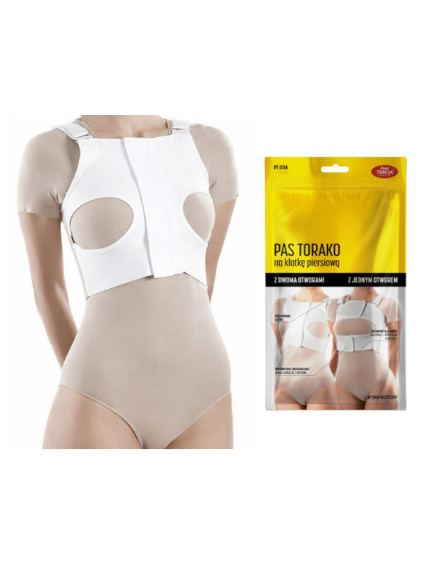 Pas torako z dwoma otworami dla kobiet Pani Teresa PT0114 to wyrób medyczny wielokrotnego użytku, przeznaczony do stabilizacji klatki piersiowej u kobiet po zabiegach operacyjnych, urazach oraz w trakcie rehabilitacji. Produkt zapewnia kontrolowany ucisk, ogranicza nadmierne ruchy klatki piersiowej i wspiera proces gojenia po zabiegach kardiochirurgicznych, torakochirurgicznych oraz po złamaniach mostka i żeber. Konstrukcja pasa uwzględnia kobiecą anatomię - dwa otwory na piersi zwiększają komfort użytkowania i umożliwiają prawidłowe dopasowanie bez nadmiernego ucisku.
