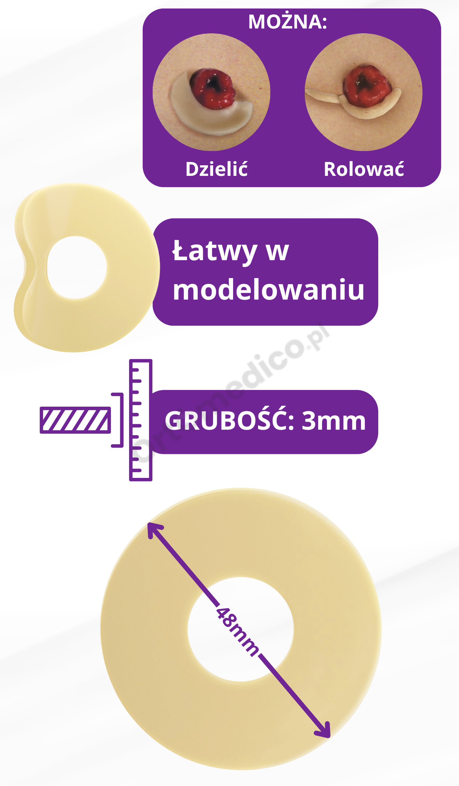 - wypełniania nierówności skóry – fałd, blizn, wgłębień, które mogą utrudniać szczelne przyleganie przylepca.
