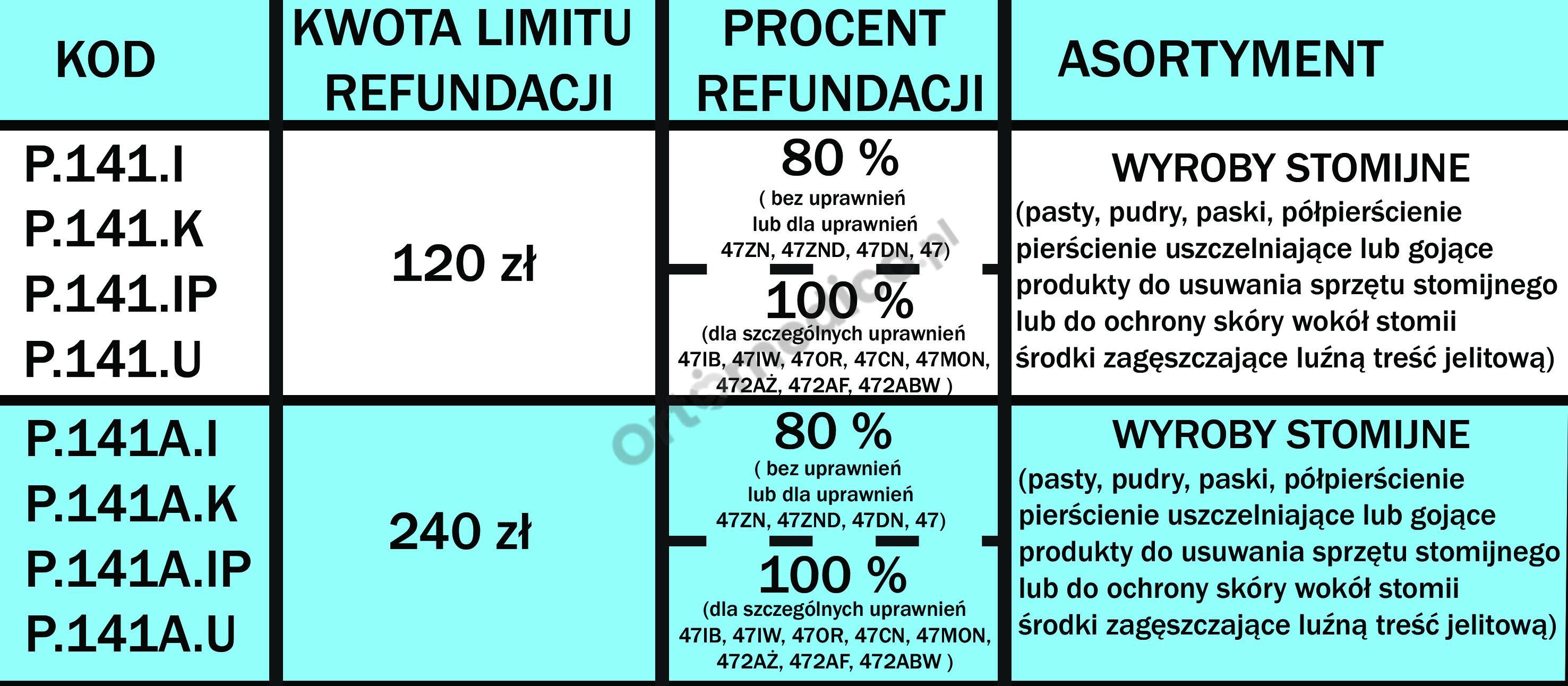Od 1 stycznia 2023 roku zmianie uległa refundacja wyrobów stomijnych. Ustanowiono 2 zlecenia na sprzęt stomijny (P.99 worki i płytki i P.141 akcesoria) oraz osobne zlecenie (P.99.A, P.141.A) dla pacjentów nowo operowanych z podwójnym limitem. Podwyższono limity: w kolostomii i ileostomii do 450 zł ; w urostomii do 530 zł, akcesoria 120 zł w tym 20% dopłaty pacjenta. Wystawiający zlecenie będzie zlecał ryczałt lub jego część lub jego wielokrotność w przypadku pacjentów z 47ZN, 47ZND, 47DN.