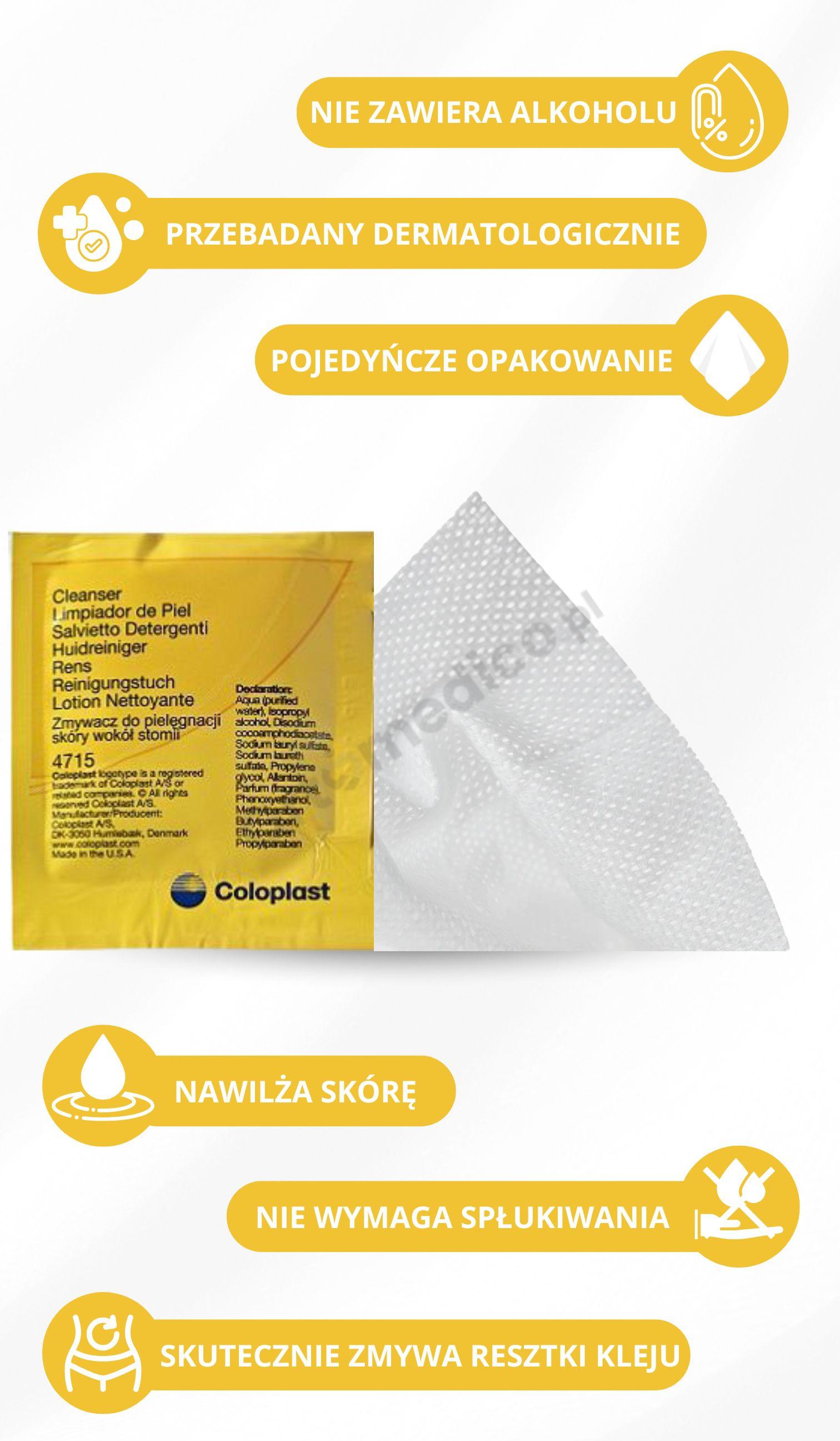Po użyciu chusteczki nie ma potrzeby spłukiwania skóry – preparat nie pozostawia lepkiej warstwy ani uczucia dyskomfortu. Skóra pozostaje czysta, świeża i gotowa na dalszą pielęgnację, np. założenie przylepca stomijnego.