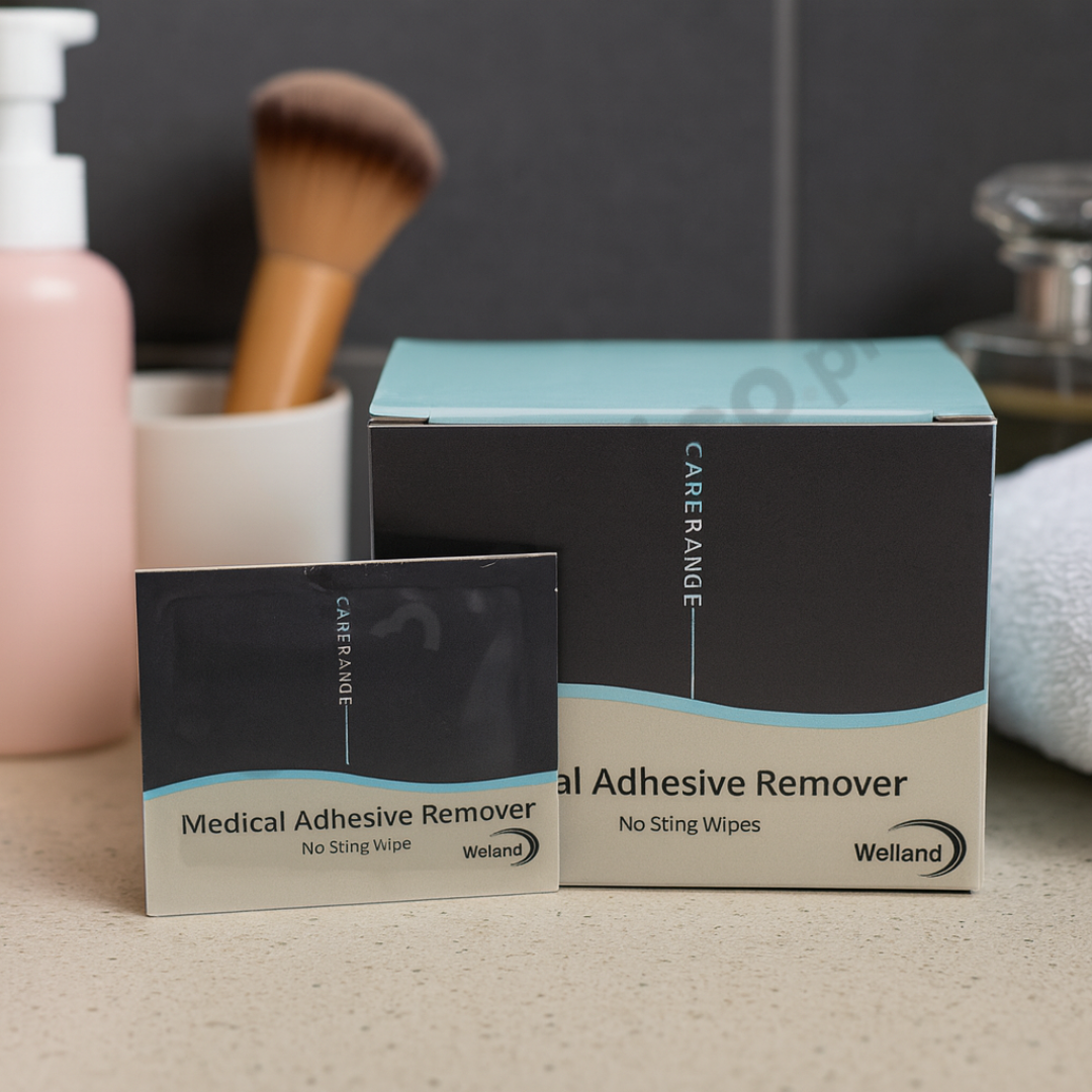 Welland Adhesive Remover WAD050 to delikatne, bezalkoholowe gaziki do usuwania przylepców i resztek kleju po sprzęcie stomijnym, stworzone z myślą o osobach, które każdego dnia dbają o higienę skóry wokół stomii.