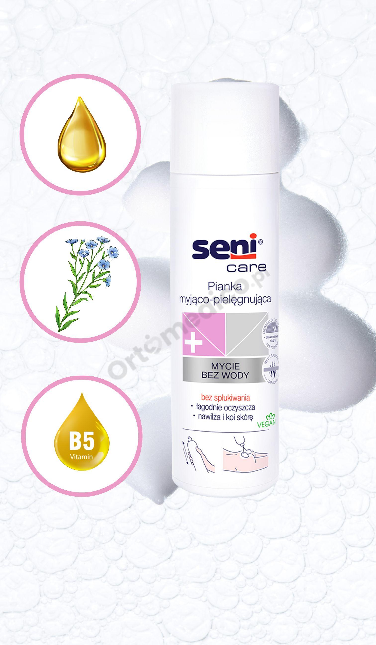 Kluczowe właściwości produktu Seni pianka do ciała myjąco-pielęgnująca bez użycia wody 500ml: