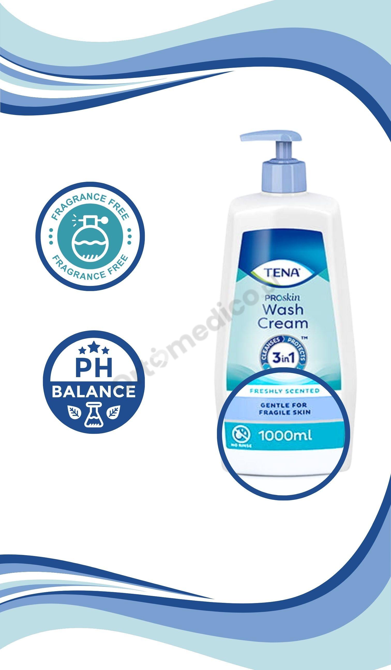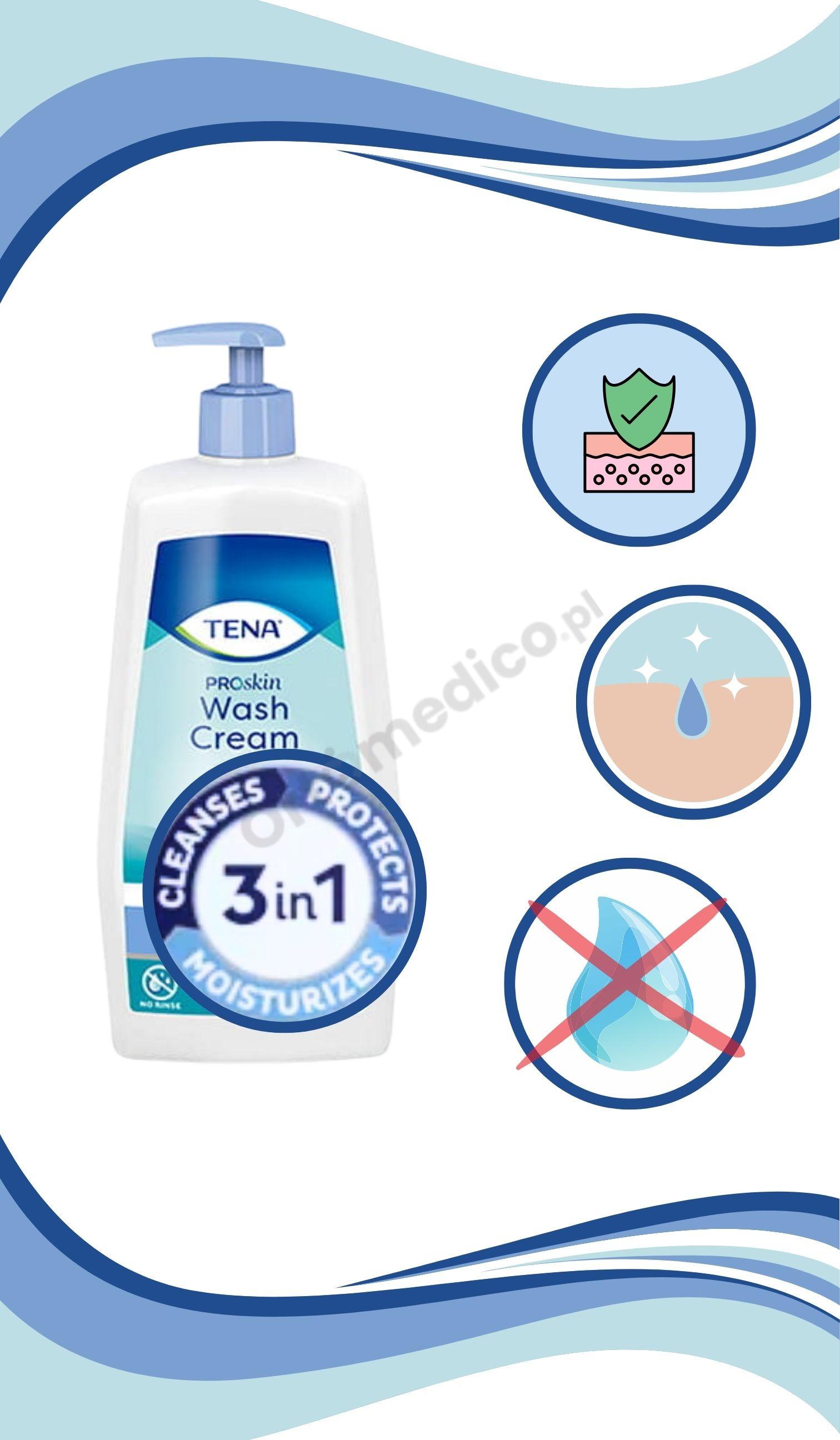 TENA ProSkin Wash Cream nawilżający jest aż 7 razy skuteczniejszy niż tradycyjne mydło i woda.* To rozwiązanie idealne dla osób, których skóra jest podatna na przesuszenie.Krem ​​myjący zapewnia miękkość i uczycie nawilżonej, zregenerowanej skóry. Dzięki temu skóra wygląda zdrowo, jest lepiej chroniona przed uszkodzeniami mechanicznymi.