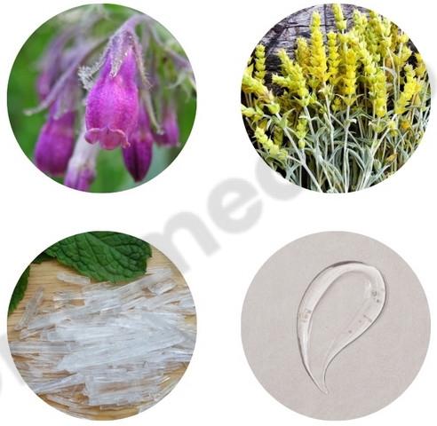 Aqua, Alcohol Denat., Glycerin, Symphytum Offcinale Root Extract, Sideritis Scardica Flower/Leaf/Stem Extract, Carbomer, Triethanolamine, Menthol, Camphor, Allantoin, Maltodextrin, Potassium Sorbate, Sodium Benzoate.