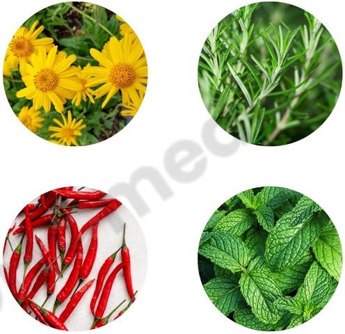 Arnika kwiat, bluszcz pospolity, bukwica zwyczajna, guarana, imbir, jeżówka purpurowa, kardamon, kora cynamonu, kora dębu, korzeń chrzanu, krwawnik pospolity, lawenda, lucerna, mięta pieprzowa, miłorząb japoński, nagietek kwiat, nostrzyk żółty, owoc róży, papryczka chili, pięciornik, rozmaryn, rumianek pospolity, szałwia, szyszki chmielu, tarczyca bajkalska, tatarak zwyczajny, tymianek, żywokost lekarski.