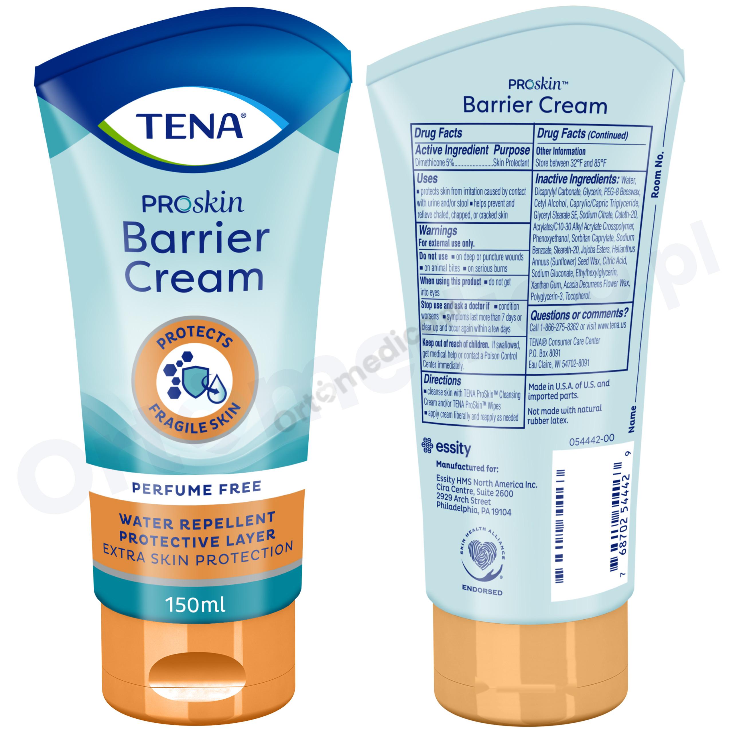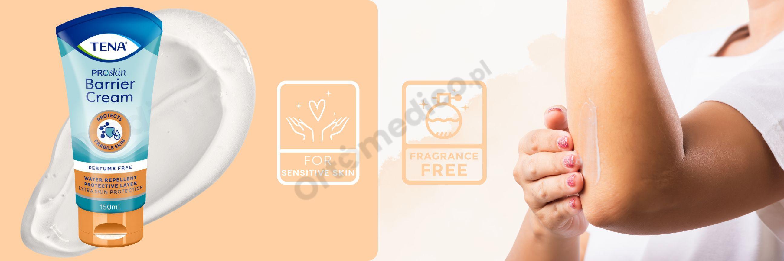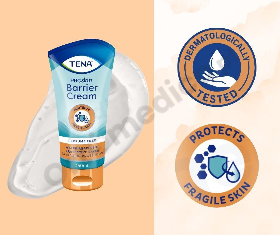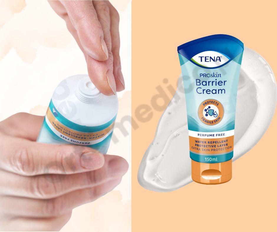 TENA ProSkin Barrier Cream to wodoodporny, przezroczysty krem idealny do zapobiegania i ochrony skóry z wczesnymi oznakami zaczerwienienia i podrażnienia spowodowanego nietrzymaniem moczu.