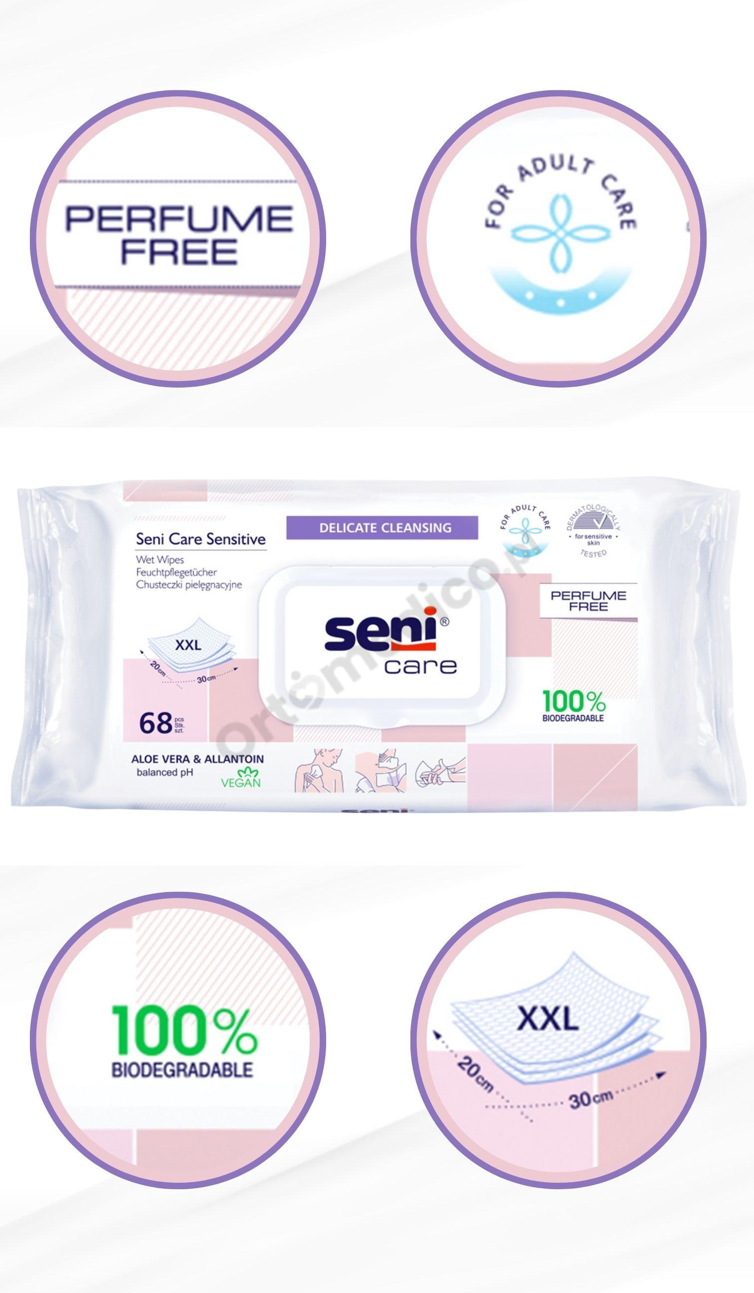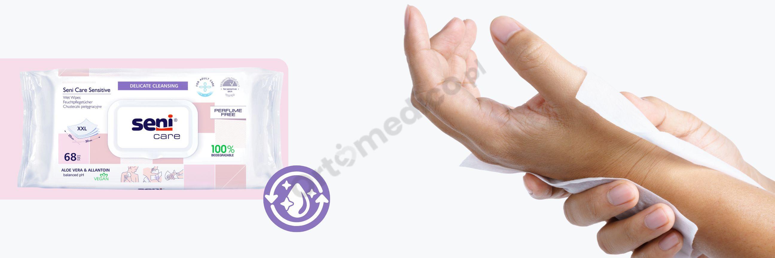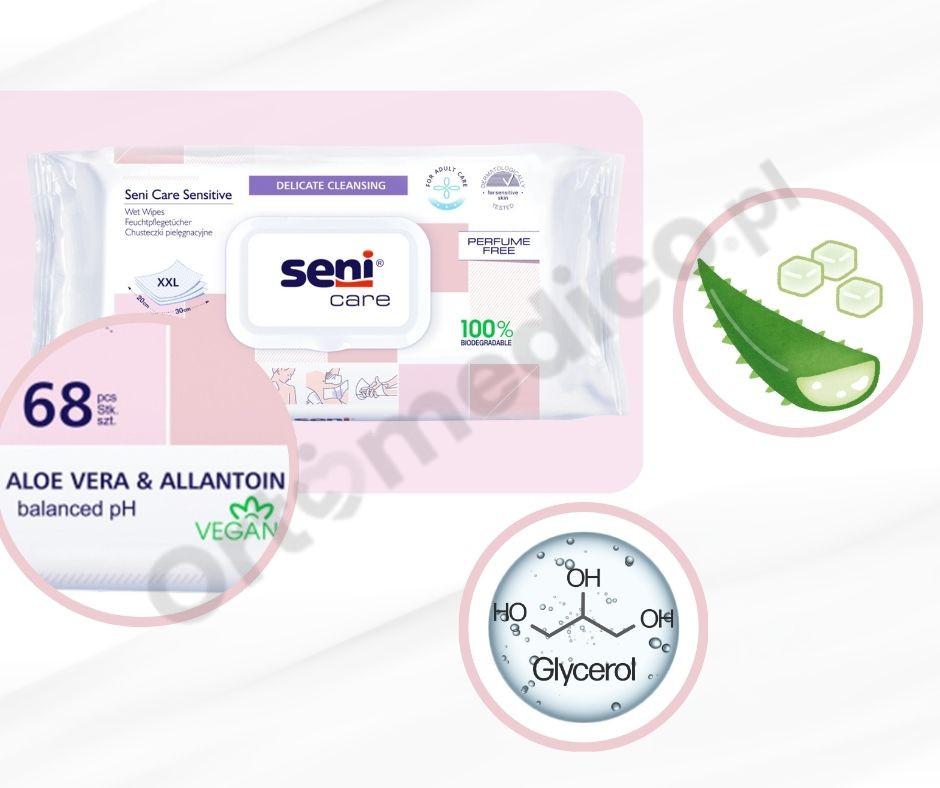 Chusteczki Seni Care Sensitive polecane są dla osób z problemem nietrzymania moczu oraz dla osób z wrażliwą i wymagającą skórą, chusteczki te zapewniają komfort, higienę i zabezpieczenie w każdej sytuacji, bez konieczności stosowania wody lub mydła. Dzięki zastosowaniu składników aktywnych oraz przyjaznej formule, chusteczki skutecznie oczyszczają, łagodzą skórę i wspierają odprowadzanie wilgoci, pozostawiają skórę nawilżoną i elastyczną.