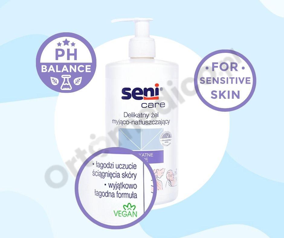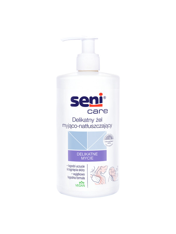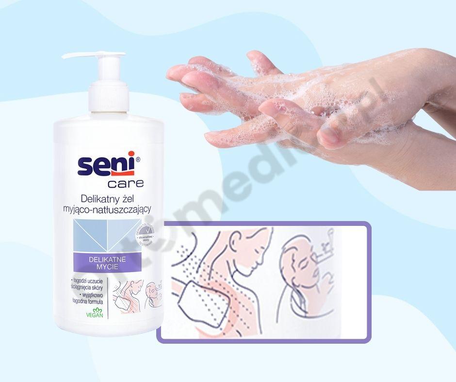 Wyjątkowych żel myjąco-natłuszczający Seni Care został opracowany z uwzględnieniem dogłębnej pielęgnacji skóry osób starszych, która zapewnia skuteczną pielęgnację. Produkt jest oczyszczający, intensywnie nawilżający i natłuszczający, usuwa pozostałości brudu, odświeża i łagodzi podrażnienia.