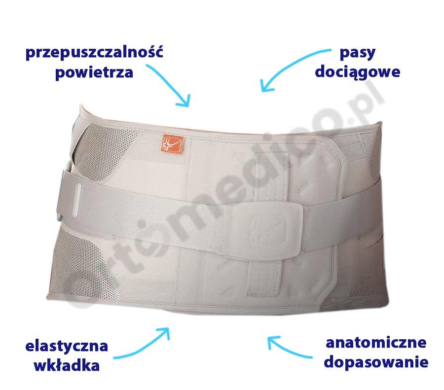 Elastyczna wkładka z tyłu zapobiega bezpośredniemu kontaktowi skóry z pasami, zapewniając dodatkowy komfort noszenia i umożliwiając montaż dodatkowych elementów za pomocą zapięcia Velcro®. Orteza została zaprojektowana z myślą o ergonomicznym kształcie, co ułatwia jej założenie i zapewnia odpowiednie dopasowanie do indywidualnej anatomii. Dodatkowo, istnieje opcja wyposażenia ortezy w sztywną pelotę lędźwiową o wysokim lub niskim profilu, co pozwala na lepsze podparcie lub dodatkową stabilizację kręgosłupa.