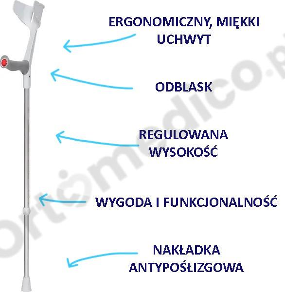 Wskazania: Wsparcie w rehabilitacji po urazach kończyn dolnych, takich jak złamania, zwichnięcia, skręcenia i kontuzje. Utrzymanie równowagi i przenoszenie ciężaru ciała w przypadku schorzeń ortopedycznych. Wspomaganie poruszania się u osób z obniżoną stabilnością lub osłabionymi mięśniami nóg. Pomoc w chodzeniu u osób starszych lub o ograniczonej sprawności ruchowej.