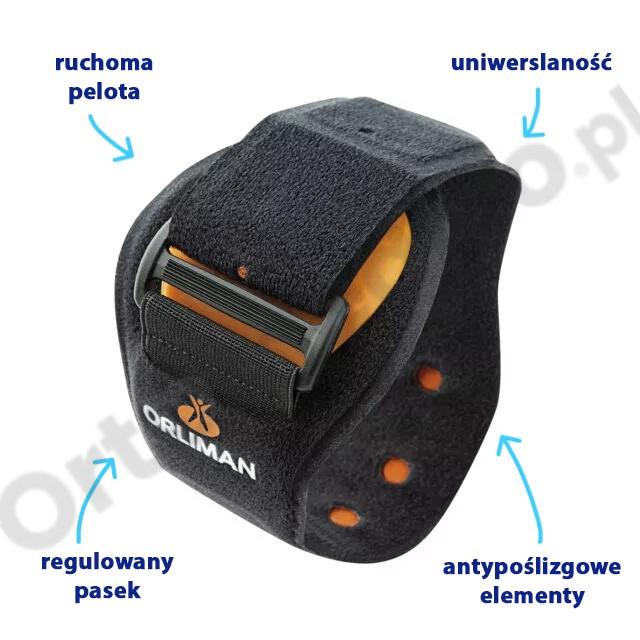Na klamrze umieszczona jest skala ułatwiająca regulację siły dociągu paska, co umożliwia dostosowanie ortezy do indywidualnych potrzeb użytkownika. Po stronie przylegającej do ciała znajdują się silikonowe elementy antypoślizgowe, które skutecznie zapobiegają przesuwaniu się opaski na przedramieniu, zwłaszcza podczas aktywności sportowej lub pracy.