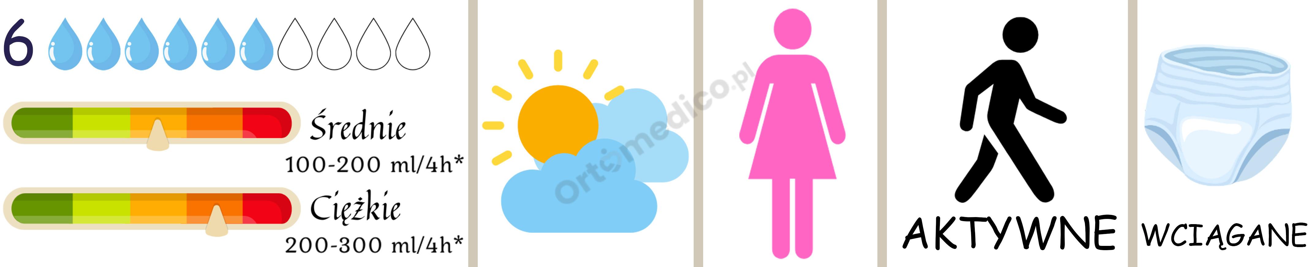 • Chłonność: poziom Plus (6 kropel) – przeznaczone na średnie nietrzymanie moczu