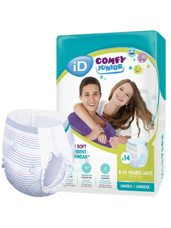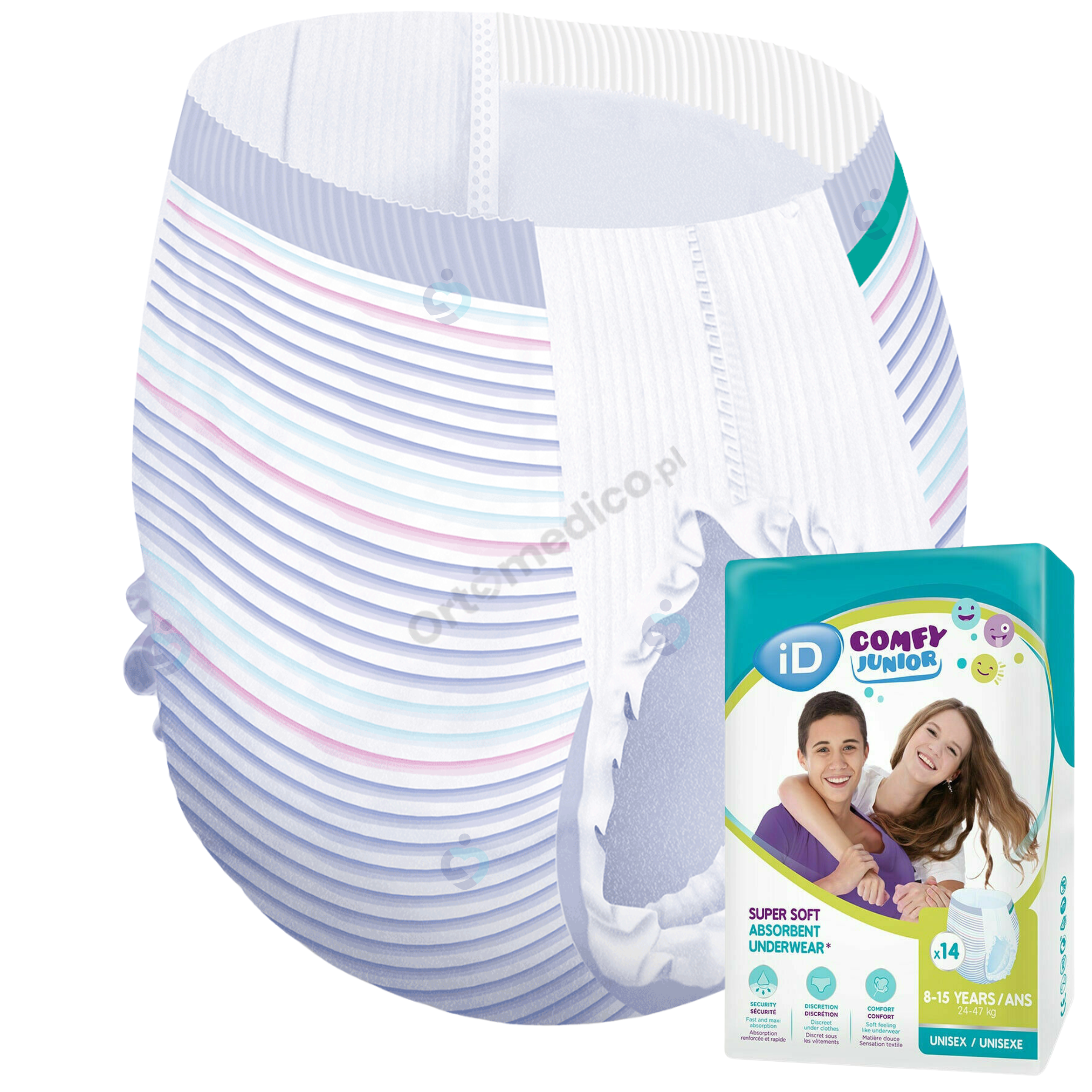 Majtki chłonne iD Comfy Junior zostały zaprojektowane z myślą o dzieciach o wadze od 24 do 47 kg, w wieku od 4 do 15 lat. Są szczególnie polecane dla dzieci i nastolatków zmagających się z nietrzymaniem moczu, które potrzebują ochrony w każdej sytuacji, bez uczucia skrępowania.