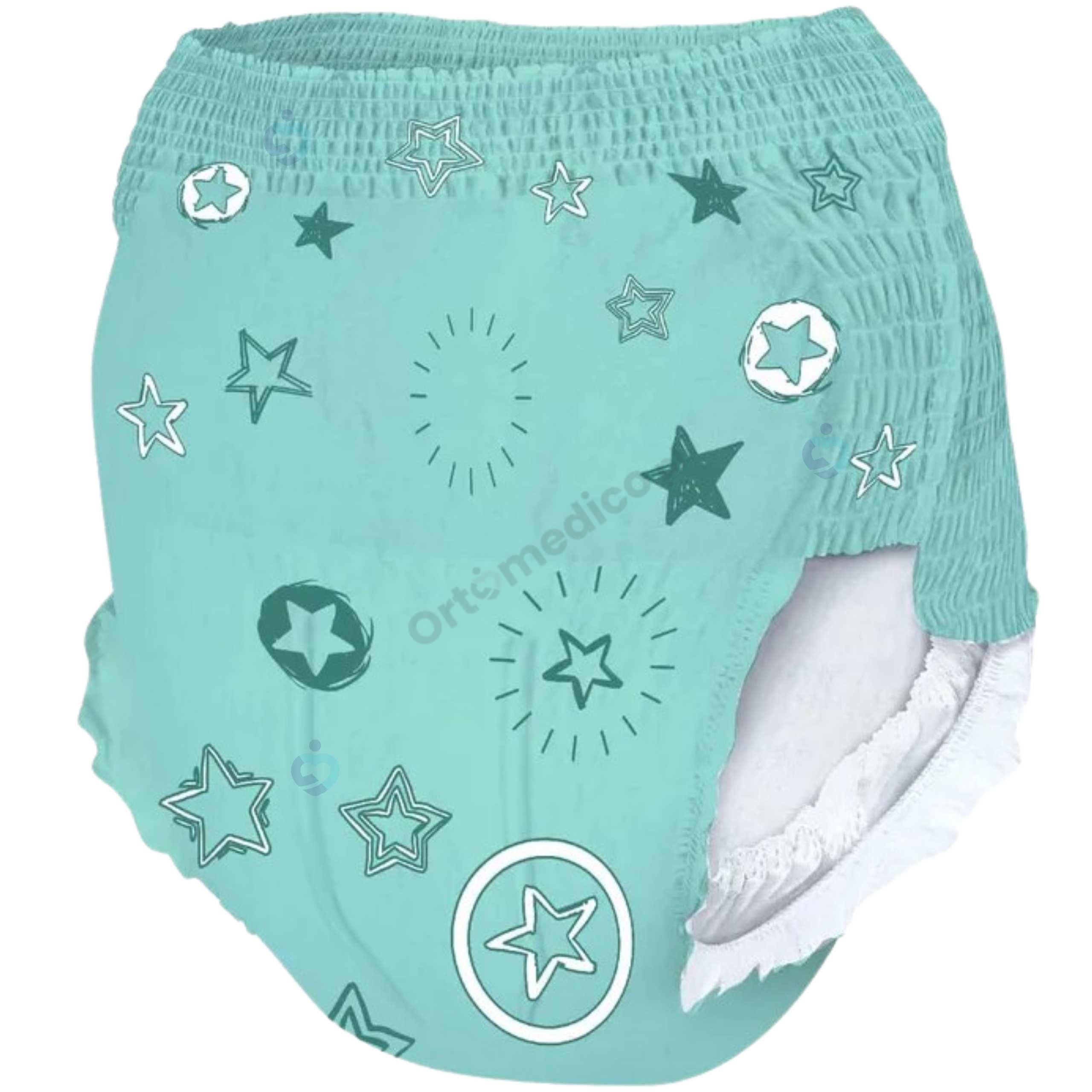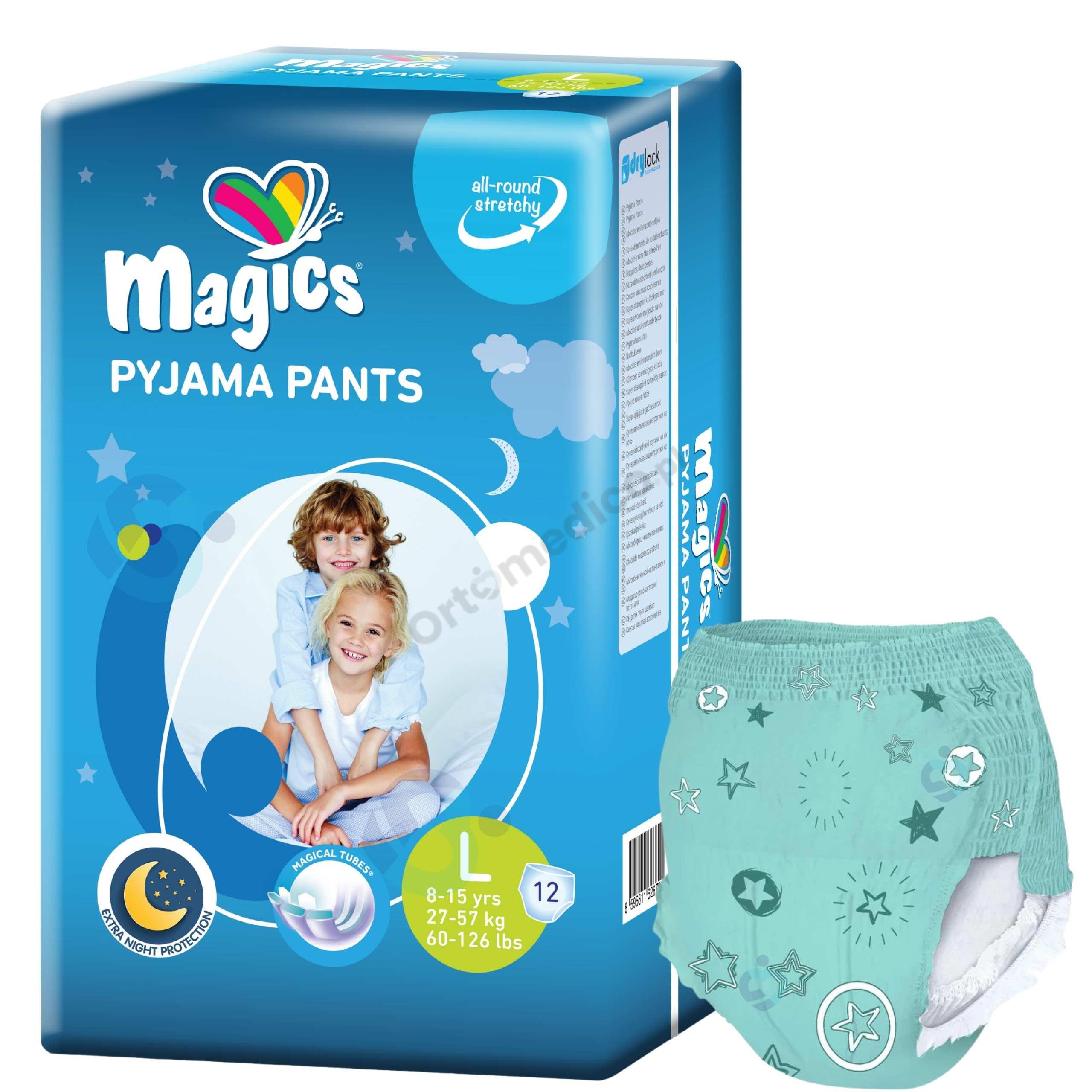 Magics Pyjama Pants 27–57 kg to dyskretne, wygodne i chłonne majtki nocne zaprojektowane dla starszych dzieci (około 8–15 lat) oraz bardzo szczupłych osób dorosłych, które zmagają się z problemem nocnego nietrzymania moczu (enurezy). Idealne do codziennego użytku w domu, jak i podczas wyjazdów, kolonii czy nocowania poza domem – zapewniają pewność siebie, komfort i spokojny sen bez obaw o przecieki.