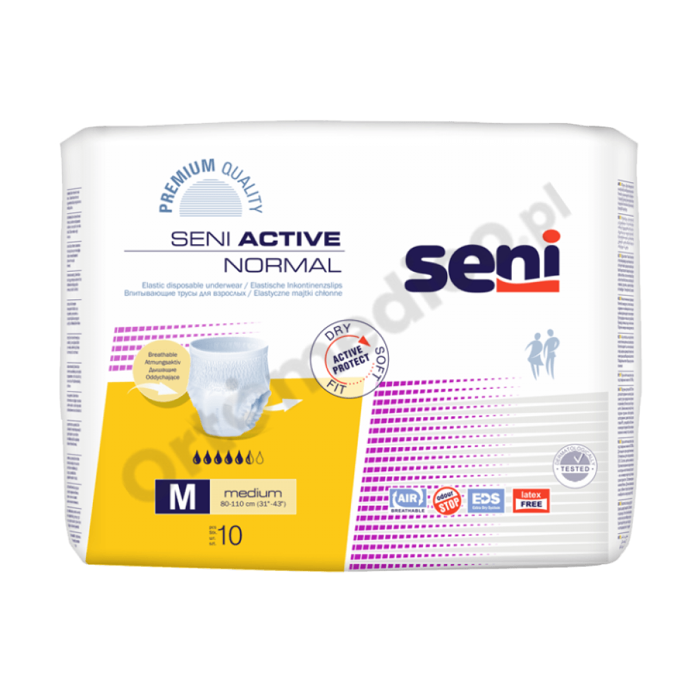 Majtki chłonne Seni Active Normal przeznaczone są dla osób z średnim stopniem nietrzymania moczu oraz przy inkontynencji kałowej. Zakładane są jak zwykła bielizna, przeznaczone zarówno dla osób aktywnych jak i dla tych o ograniczonej mobilności. Chłonność jaką posiadają te majtki to 5,5/7 kropelek.