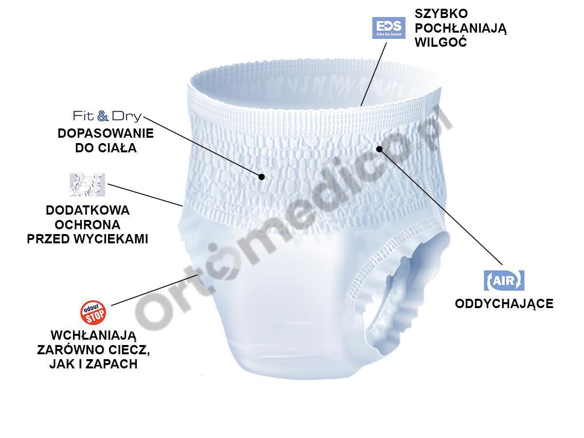 Są wykonane z miękkich, oddychających materiałów, które minimalizują ryzyko powstawania odparzeń i podrażnień skóry. Są zakładane jak zwykłe majtki, dzięki czemu umożliwiają wygodne zakładanie.