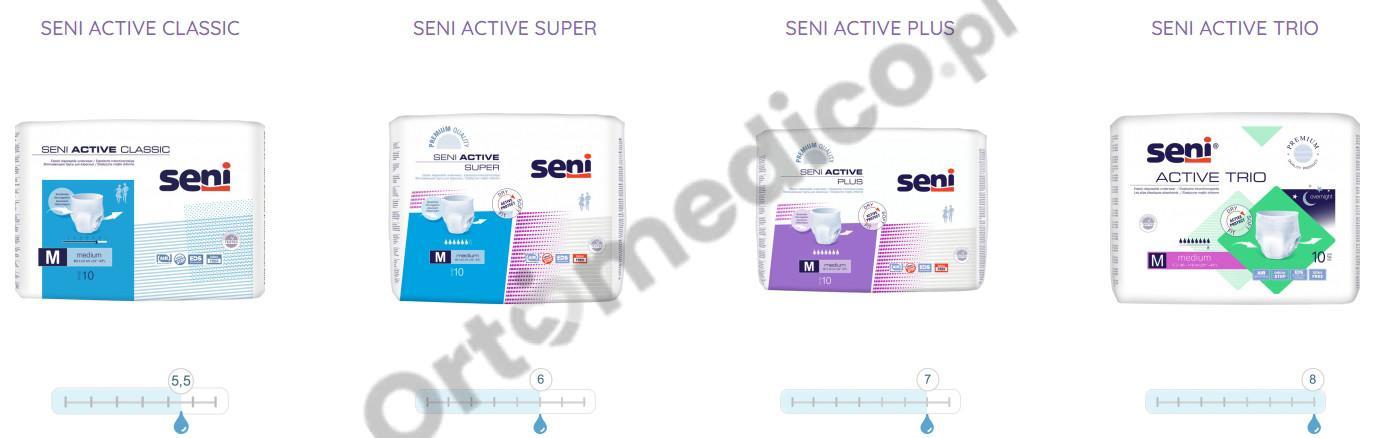 Majtki chłonne Seni Active Plus przeznaczone są dla osób z ciężkim stopniem nietrzymania moczu oraz przy inkontynencji kałowej. Zakładane są jak zwykła bielizna, przeznaczone zarówno dla osób aktywnych jak i dla tych o ograniczonej mobilności. Chłonność jaką posiadają te majtki to 7/7 kropelek, dzięki czemu idealnie nadają się również na noc.