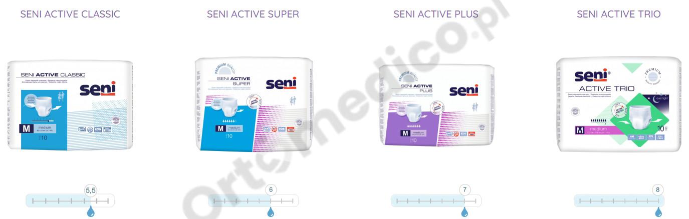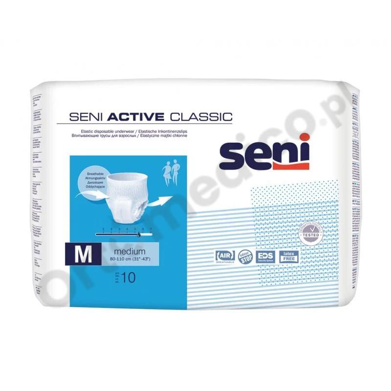 Majtki chłonne Seni Active Classic przeznaczone są dla osób z średnim stopniem nietrzymania moczu oraz przy inkontynencji kałowej. Zakładane są jak zwykła bielizna, przeznaczone zarówno dla osób aktywnych jak i dla tych o ograniczonej mobilności. Chłonność jaką posiadają te majtki to 5,5/7 kropelek.