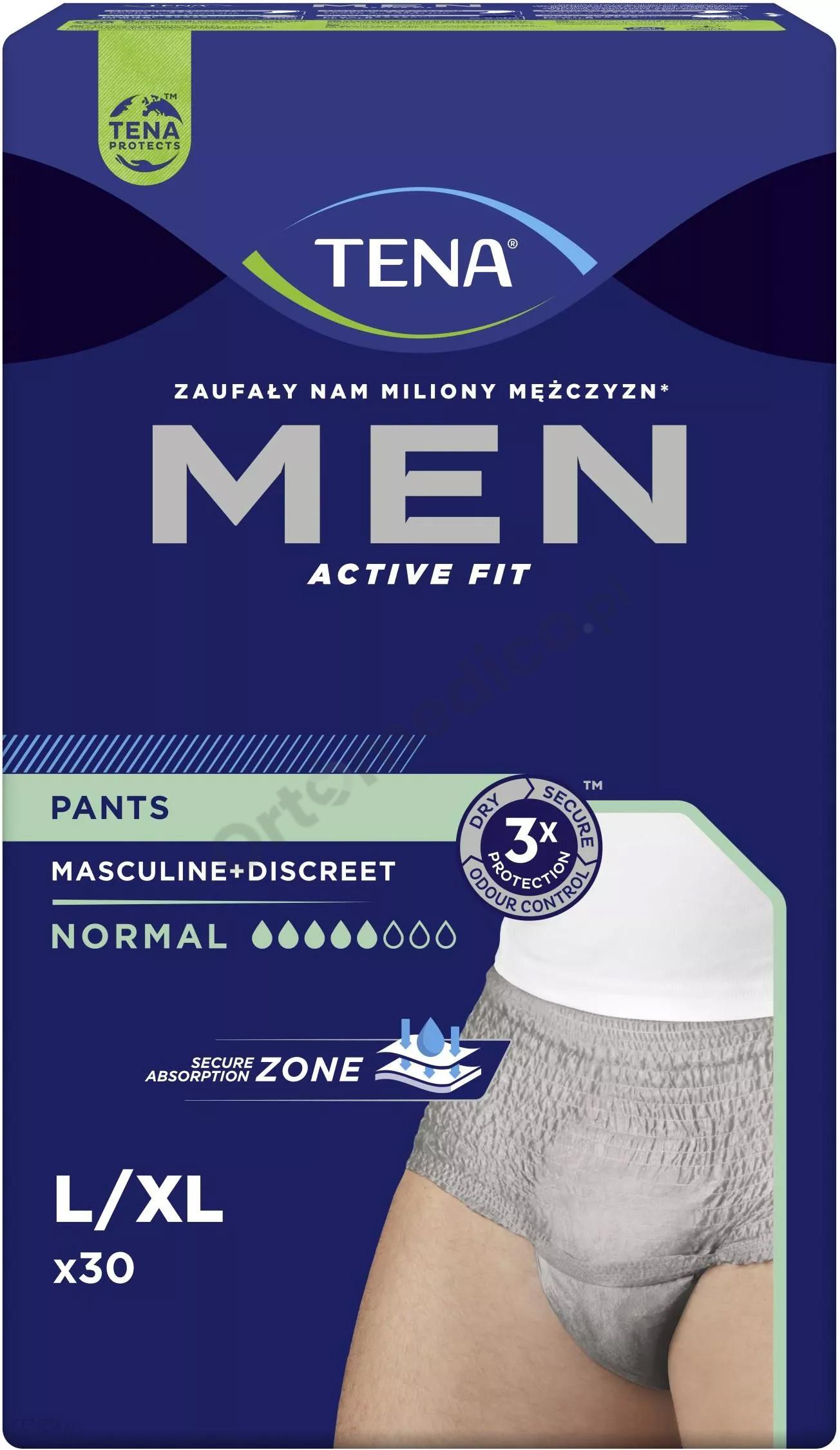 Majtki chłonne TENA Men Pants przeznaczone są dla aktywnych mężczyzn, którzy potrzebują pewnej ochrony przed nietrzymaniem moczu. TENA Men oferuje mężczyznom w każdym wieku skuteczną kontrolę nad średnim nietrzymaniem moczu. Chłonność jaką posiadają te majtki to 5/8 kropelek.