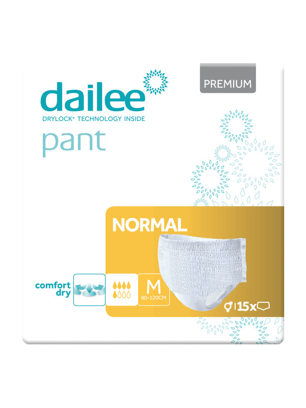Dailee Pant Premium Normal to wciągane majtki chłonne od belgijskiego producenta, które przeznaczone są dla osób dorosłych z średnim stopniem nietrzymania moczu. Chłonność jaką posiadają te majtki to 5/8 kropel.