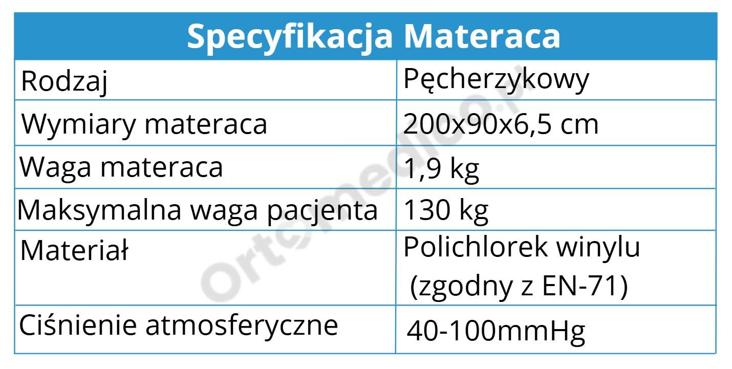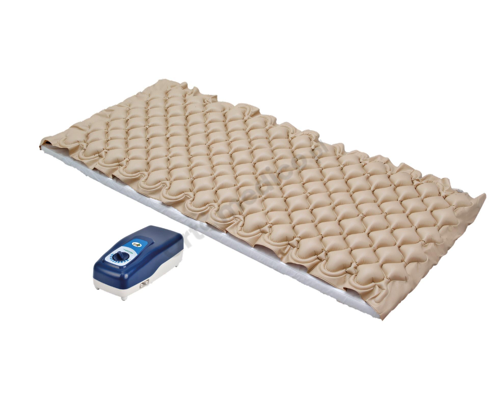 Materac pneumatyczny z konstrukcją bąbelkową zapewnia optymalne wsparcie dla ciała poprzez równomierne rozłożenie nacisku. Cykliczne napełnianie powietrzem 130 komór w dwóch sekcjach materaca sprzyja poprawie krążenia i zapobiega powstawaniu odleżyn. Cicha pompa została wyposażona we wskaźnik poziomu ciśnienia, ustawiony według masy ciała pacjenta oraz posiada zaczepy ma łóżko z antypoślizgowymi nasadkami. Głośność pompy, poniżej 31 decybeli. Wypełnianie komory powietrzem w cyklach odbywają się co 12 minut. Działa na zasadzie zmiennociśnieniowej, co oznacza, że regularnie zmienia punkty podparcia ciała, zapobiegając długotrwałemu naciskowi na te same obszary skóry.