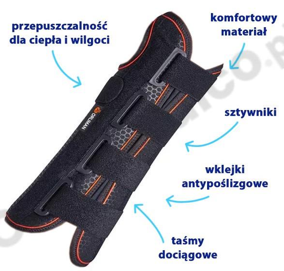Wzmocniona część grzbietowa - dodatkowe plastikowe sztywniki w części grzbietowej ortez wzmacniają działanie sztywnika dłoniowego, co przekłada się na zwiększoną stabilizację stawu.