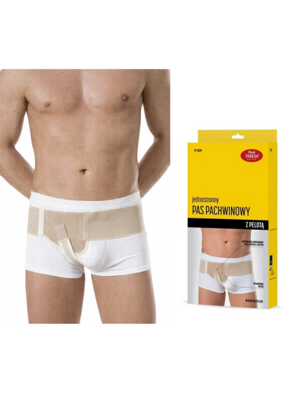 Jednostronny pas pachwinowy PT 0109 z pelotą to wyrób medyczny przeznaczony do stabilizacji i podtrzymania okolicy pachwinowej w przypadku przepukliny pachwinowej lewej lub prawej. Produkt stosowany jest zarówno profilaktycznie, jak i wspomagająco w leczeniu zachowawczym oraz po zabiegach operacyjnych. Pas wywiera kontrolowany ucisk na okolicę przepukliny za pomocą anatomicznie wyprofilowanej peloty, pomagając w jej odprowadzeniu i ograniczeniu powiększania się ubytku. Konstrukcja pasa umożliwia indywidualne dopasowanie do budowy ciała oraz wybór strony stosowania - lewej lub prawej.