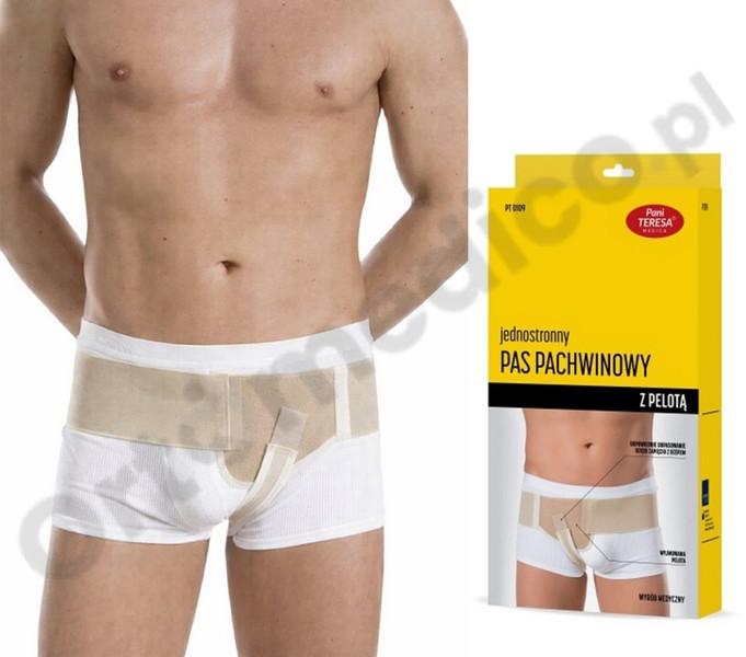 Jednostronny pas pachwinowy PT 0109 z pelotą to wyrób medyczny przeznaczony do stabilizacji i podtrzymania okolicy pachwinowej w przypadku przepukliny pachwinowej lewej lub prawej. Produkt stosowany jest zarówno profilaktycznie, jak i wspomagająco w leczeniu zachowawczym oraz po zabiegach operacyjnych. Pas wywiera kontrolowany ucisk na okolicę przepukliny za pomocą anatomicznie wyprofilowanej peloty, pomagając w jej odprowadzeniu i ograniczeniu powiększania się ubytku. Konstrukcja pasa umożliwia indywidualne dopasowanie do budowy ciała oraz wybór strony stosowania - lewej lub prawej.