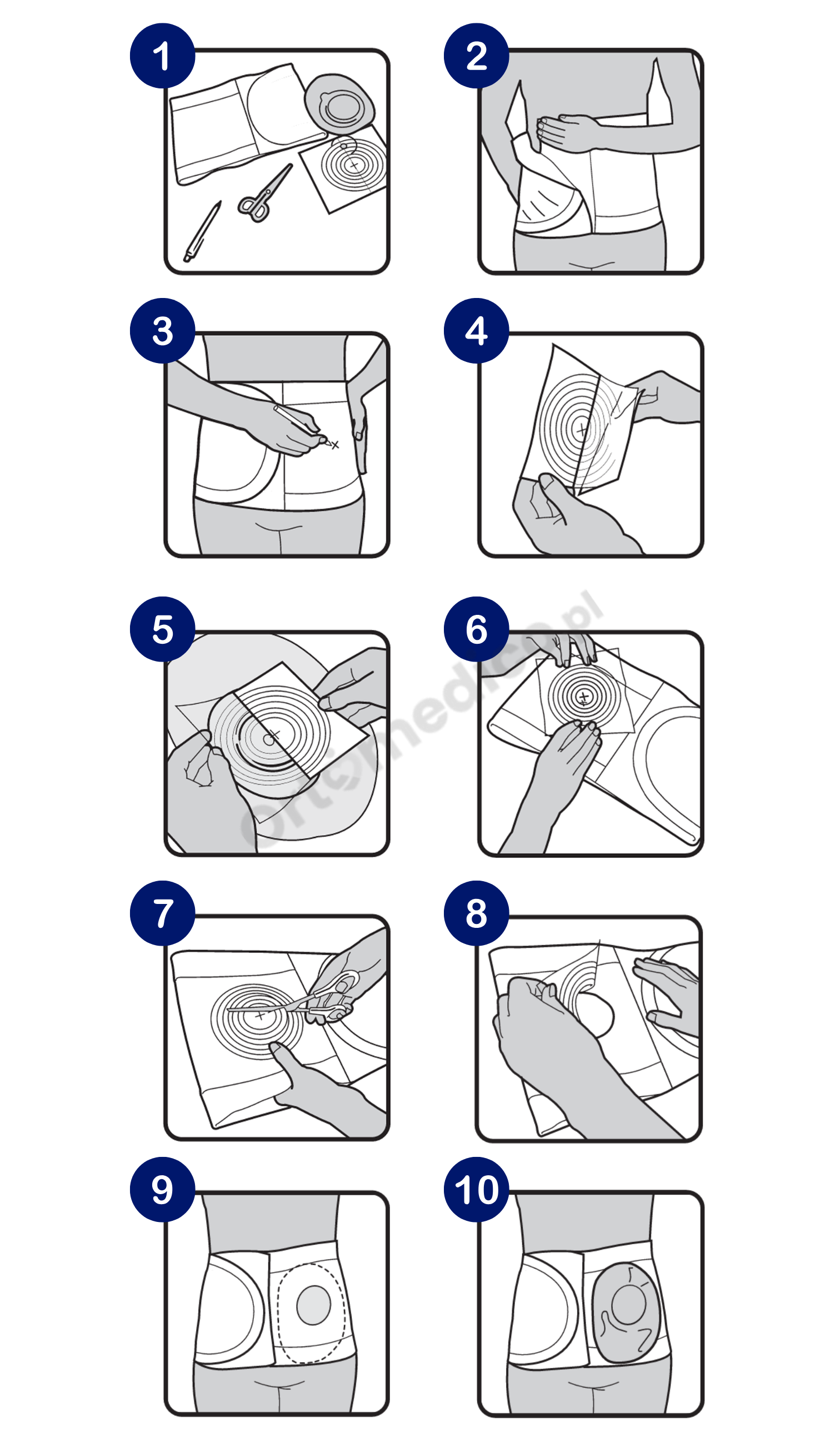 Skorzystaj z dołączonego szablonu, by wyciąć w panelu pasa otwór odpowiadający rozmiarowi worka stomijnego. Użyj ostrych nożyczek i wycinaj ostrożnie, by nie uszkodzić materiału.