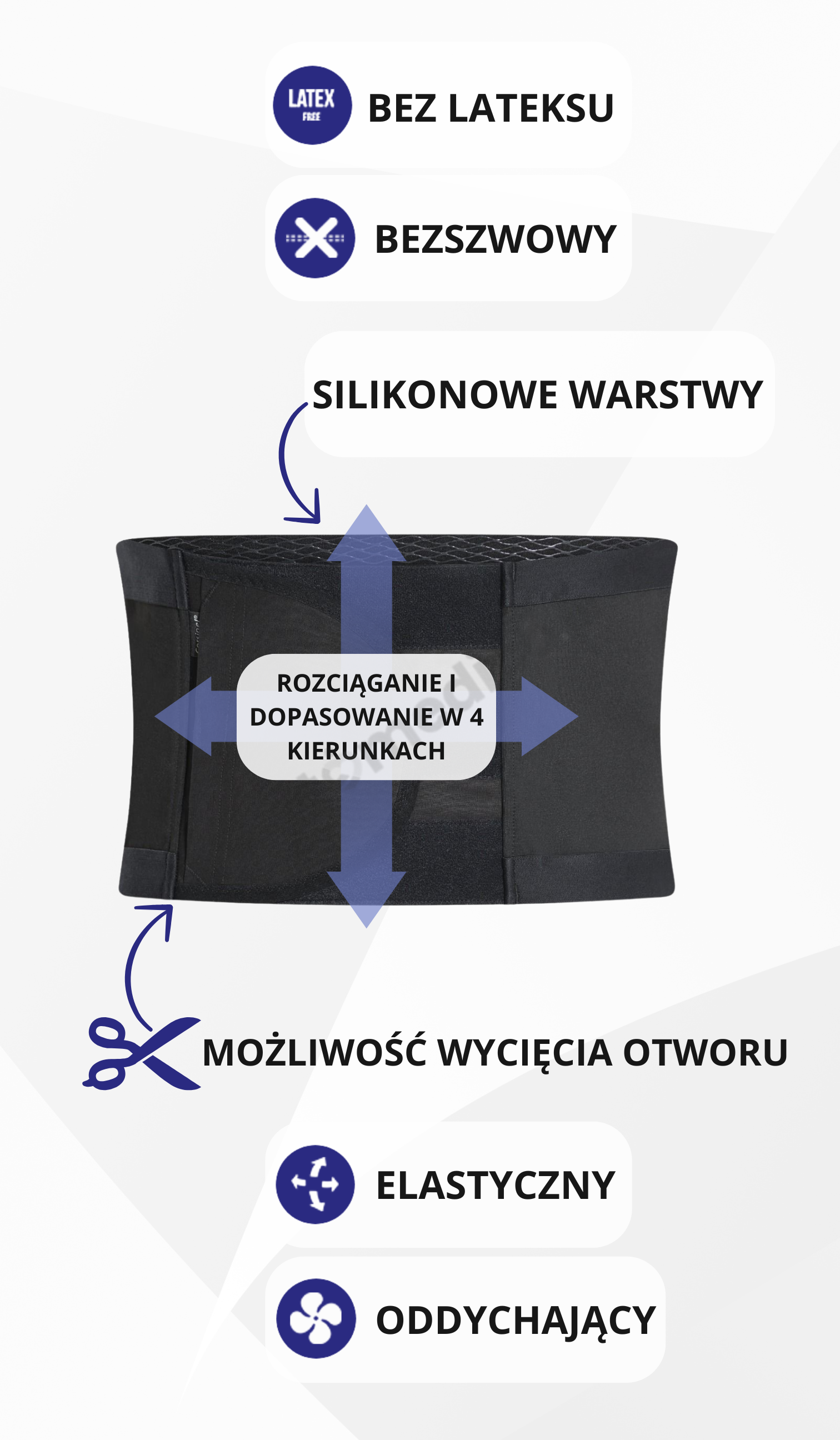 Materiał rozciąga się równomiernie we wszystkich kierunkach, zapewniając jednocześnie optymalne podtrzymanie brzucha i pełną swobodę ruchu. Pas nie krępuje codziennej aktywności i sprawdza się zarówno w spoczynku, jak i w ruchu – np. podczas chodzenia, pracy czy ćwiczeń fizycznych.