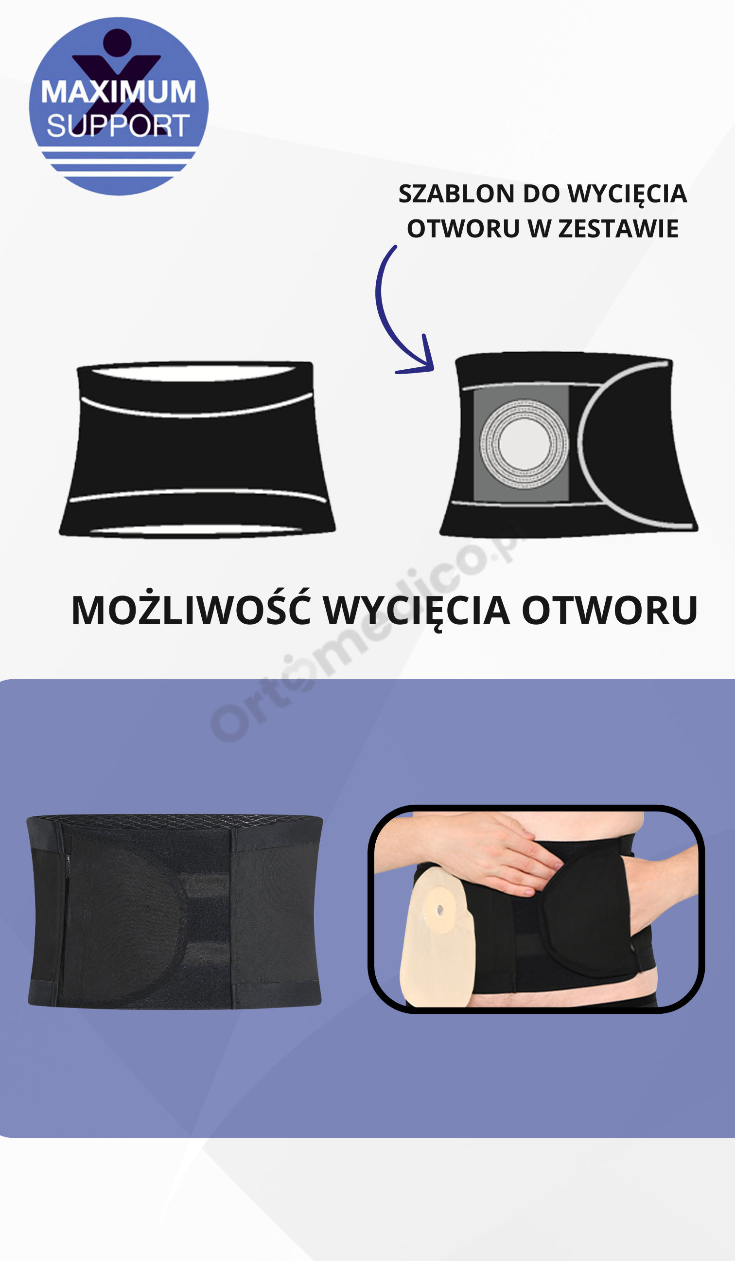 Pas zawiera specjalny panel, w którym można samodzielnie wyciąć otwór dopasowany do rozmiaru worka stomijnego. W zestawie dołączony jest szablon, który ułatwia precyzyjne dopasowanie otworu do indywidualnych potrzeb pacjenta.