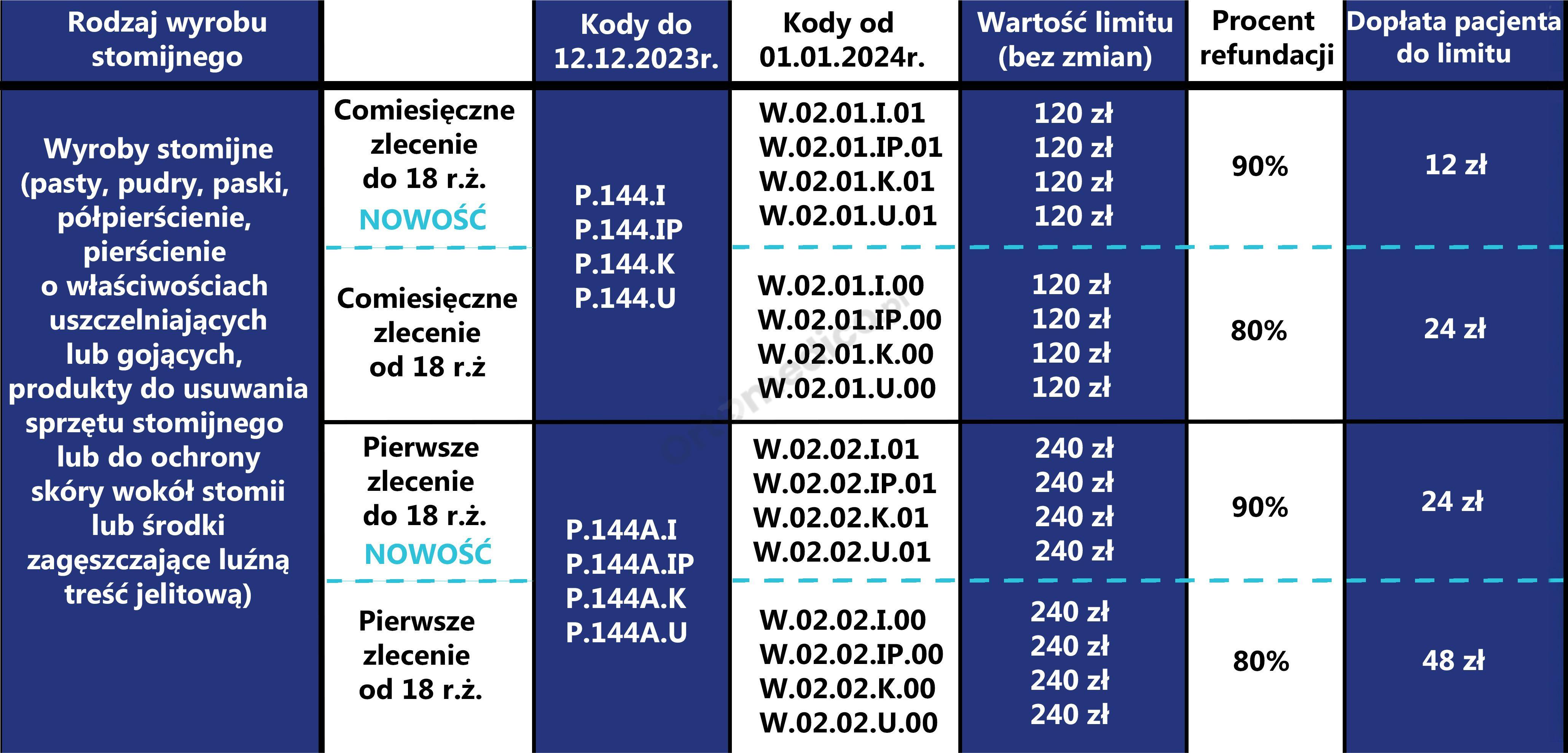Od 1 stycznia 2023 roku zmianie uległa refundacja wyrobów stomijnych. Ustanowiono 2 zlecenia na sprzęt stomijny (P.99 worki i płytki i P.141 akcesoria) oraz osobne zlecenie (P.99.A, P.141.A) dla pacjentów nowo operowanych z podwójnym limitem. Podwyższono limity: w kolostomii i ileostomii do 450 zł ; w urostomii do 530 zł, akcesoria 120 zł w tym 20% dopłaty pacjenta. Wystawiający zlecenie będzie zlecał ryczałt lub jego część lub jego wielokrotność w przypadku pacjentów z 47ZN, 47ZND, 47DN.