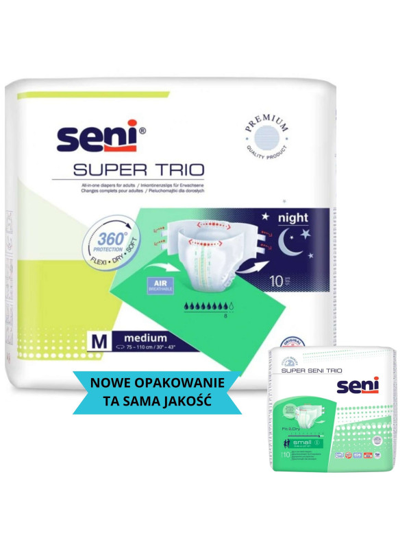 Pieluchomajtki Super Seni Trio przeznaczone są dla osób z ciężkim i bardzo ciężkim stopniem nietrzymania moczu oraz przy inkontynencji kałowej. Przeznaczone zarówno dla osób aktywnych jak i dla tych o ograniczonej mobilności. Chłonność jaką posiada ta pielucha to 8/9 kropelek, dzięki czemu idealnie nadają się również na noc.