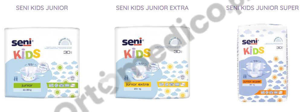 Pieluchomajtki Seni Kids to dobre i sprawdzone zabezpieczenie przeznaczone dla dzieci z nietrzymaniem moczu w stopniu średnim i ciężkim. Polecane dla dzieci, które wyrosły z tradycyjnych pieluszek. Seni Kids Junior Super przeznaczone są dla dzieci o wadze powyżej 20 kilogramów o obwodzie w pasie od 40 do 60 cm.
