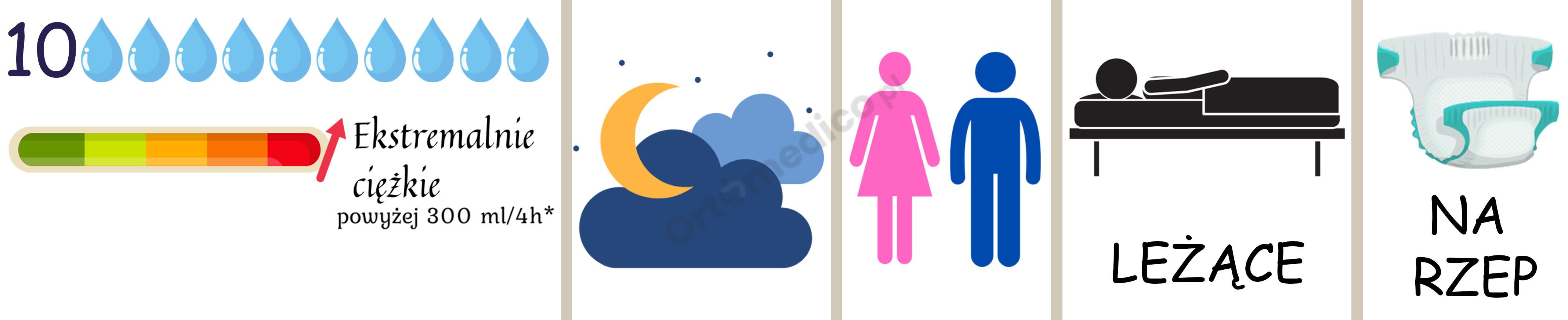 - Dedykowane do ekstremalnych przypadków nietrzymania moczu, gdzie konieczna jest niezawodna ochrona przed bardzo dużą ilością płynów.