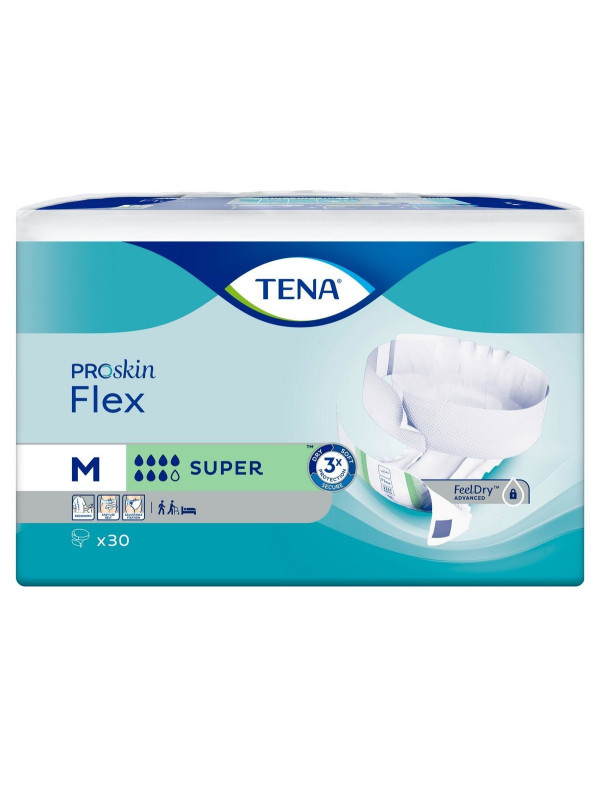 Pieluchomajtki TENA Flex Super przeznaczone są dla osób z ciężkim stopniem nietrzymania moczu oraz przy inkontynencji kałowej. Przeznaczone zarówno dla osób aktywnych jak i dla tych o ograniczonej mobilności. Chłonność jaką posiada ta pielucha to 7/8 kropelek, dzięki czemu idealnie nadają się również na noc.