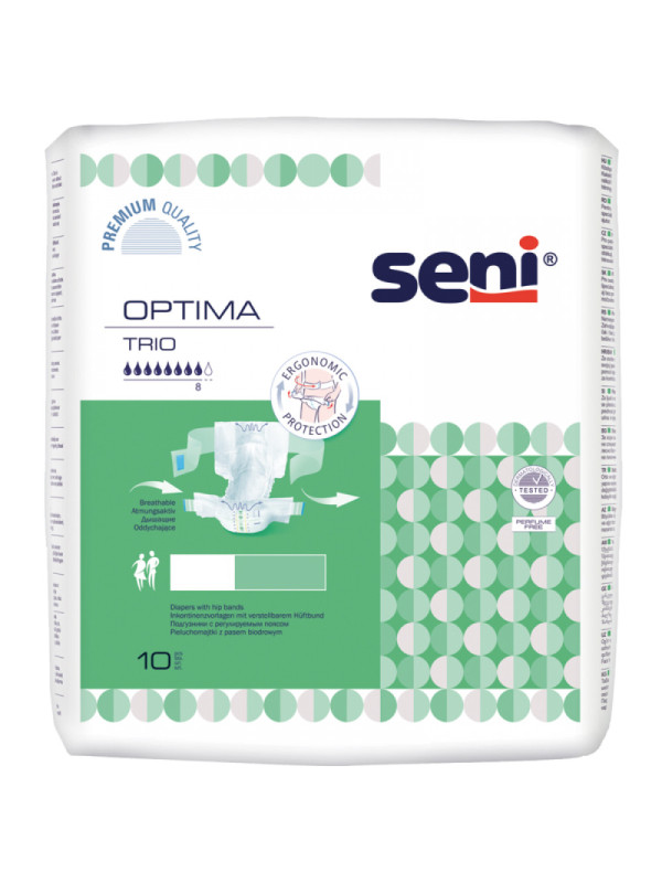 Pieluchomajtki Seni Optima Trio przeznaczone są dla osób z ciężkim stopniem nietrzymania moczu oraz przy inkontynencji kałowej. Przeznaczone zarówno dla osób aktywnych jak i dla tych o ograniczonej mobilności. Chłonność jaką posiada ta pielucha to 8/9 kropelek, dzięki czemu idealnie nadają się również na noc.