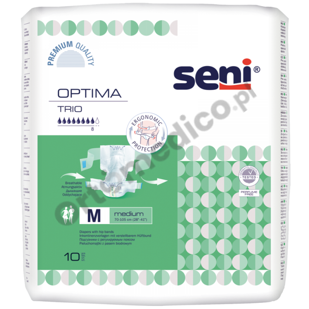 Łączą one zalety pieluch anatomicznych i tradycyjnych pieluchomajtek. Seni Optima Trio polecane są przede wszystkim osobom otyłym.