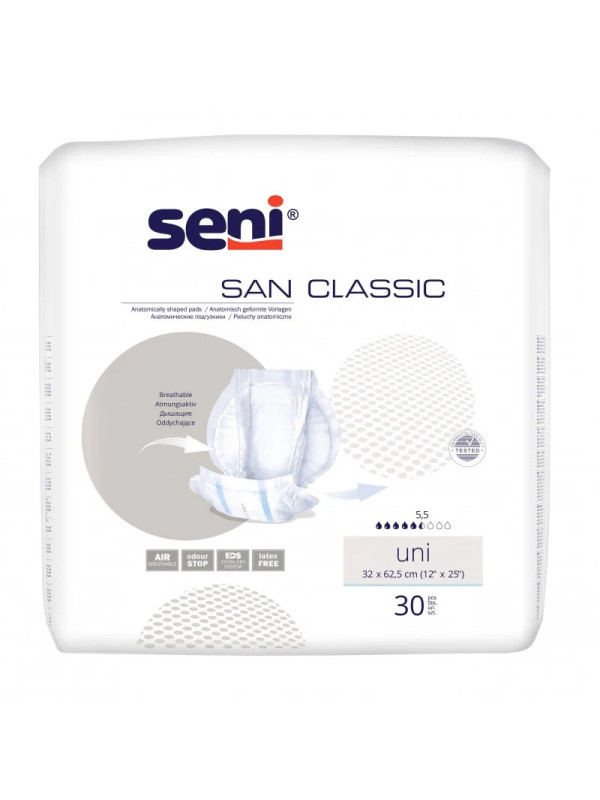 Pieluchy anatomiczne San Seni Classic Uni przeznaczone są dla osób z średnim stopniem nietrzymania moczu. Przeznaczone zarówno dla osób aktywnych jak i dla tych o ograniczonej mobilności. Chłonność jaką posiadają te pieluchy to 5,5/9 kropelek. To rozwiązanie dla osób, które szukają możliwości doboru właściwego produktu bez względu na budowę ciała oraz produktu, który pozwala na swobodę ruchów i codzienną niezakłóconą aktywność. Seni San zakłada się przy pomocy specjalnych majtek mocujących wielorazowego użytku.