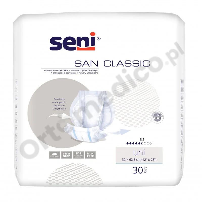 Pieluchy anatomiczne San Seni Classic Uni przeznaczone są dla osób z średnim stopniem nietrzymania moczu. Przeznaczone zarówno dla osób aktywnych jak i dla tych o ograniczonej mobilności. Chłonność jaką posiadają te pieluchy to 5,5/9 kropelek. To rozwiązanie dla osób, które szukają możliwości doboru właściwego produktu bez względu na budowę ciała oraz produktu, który pozwala na swobodę ruchów i codzienną niezakłóconą aktywność. Seni San zakłada się przy pomocy specjalnych majtek mocujących wielorazowego użytku.