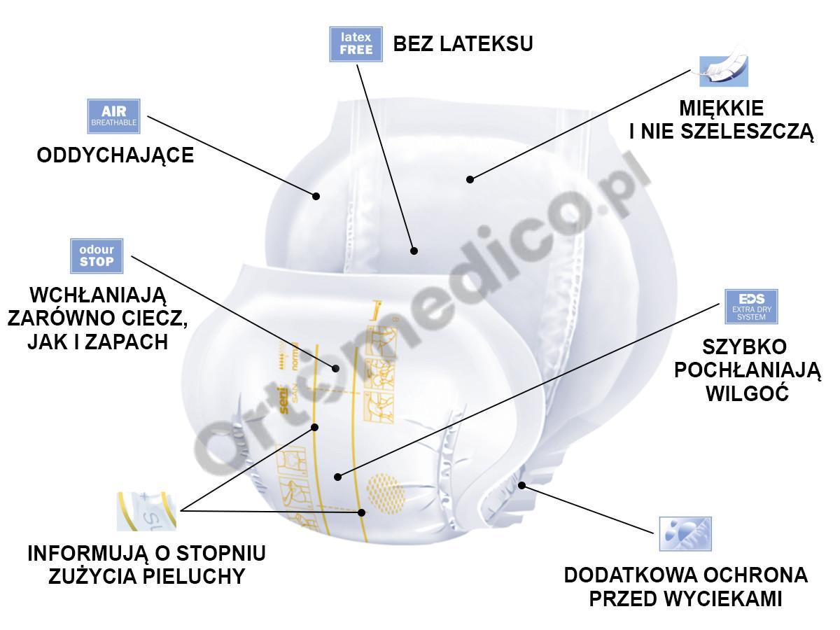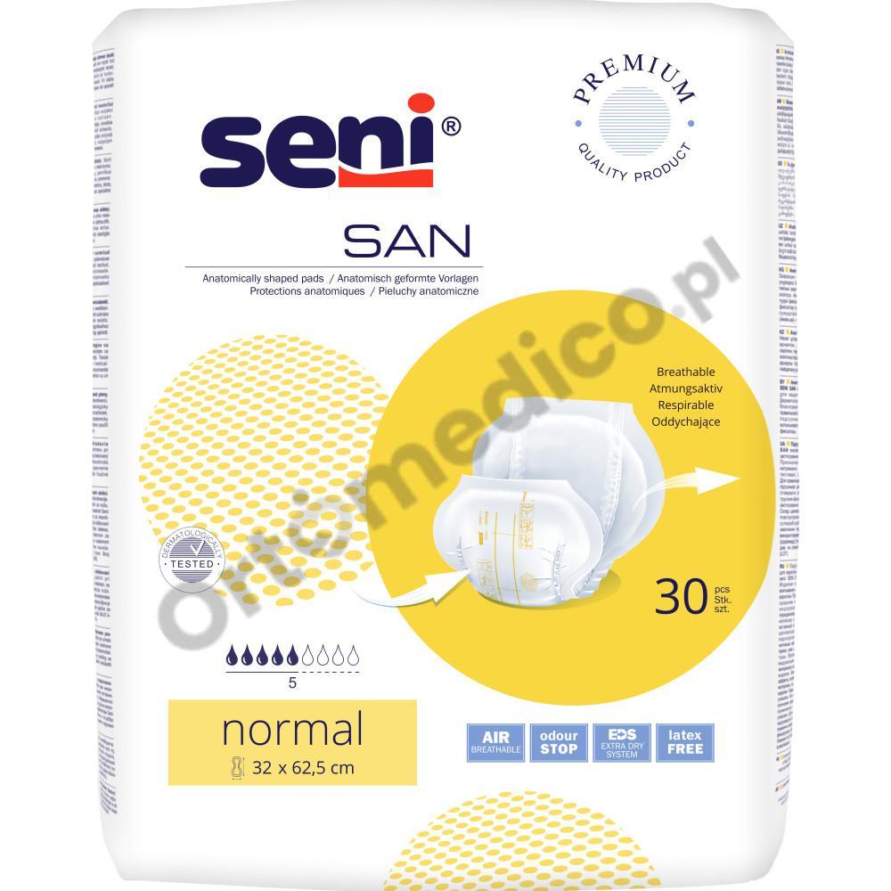 Pieluchy anatomiczne Seni San Normal przeznaczone są dla osób z średnim stopniem nietrzymania moczu. Przeznaczone zarówno dla osób aktywnych jak i dla tych o ograniczonej mobilności. Chłonność jaką posiadają te pieluchy to 5/9 kropelek.